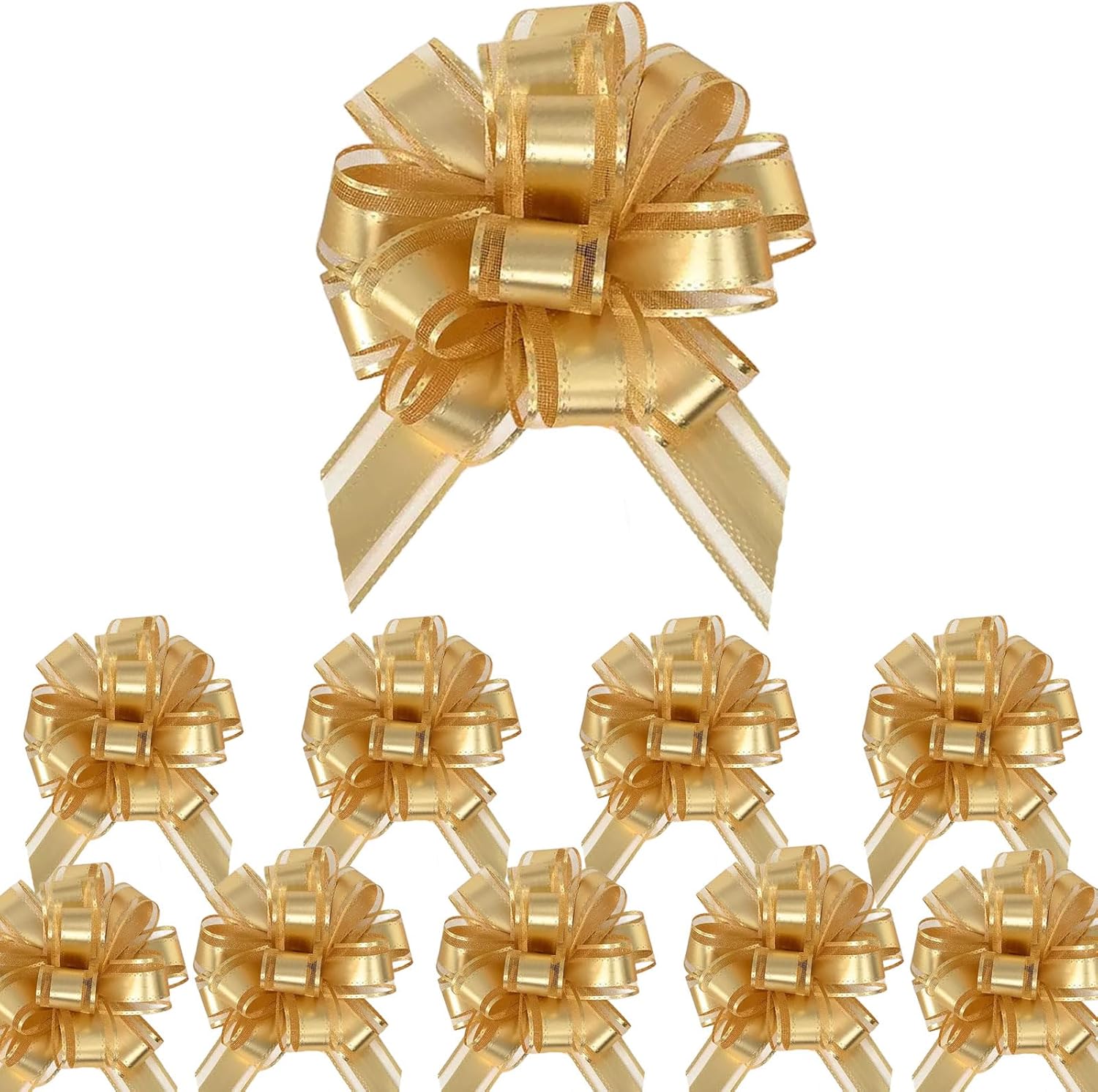 • PULL BOWS PACKAGE CONTENTS: Set of 10 elegant gold pull bows, each measuring 4 inches in diameter when fully assembled - perfect for gift wrapping and decorations