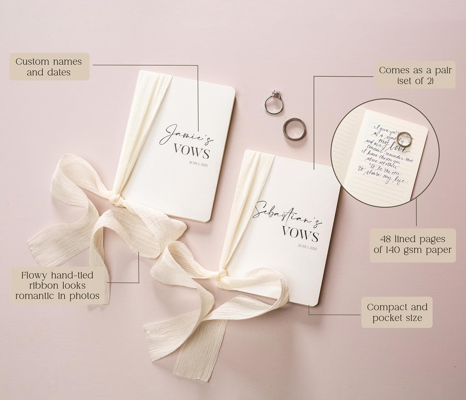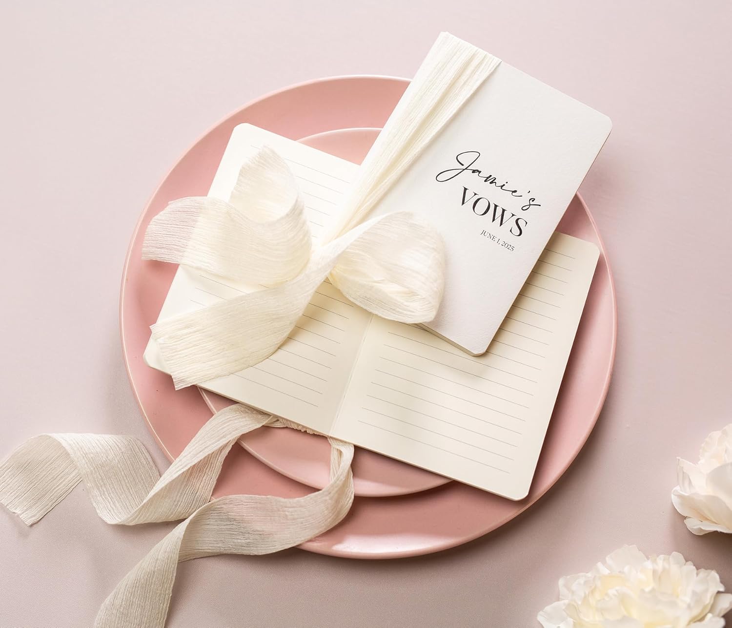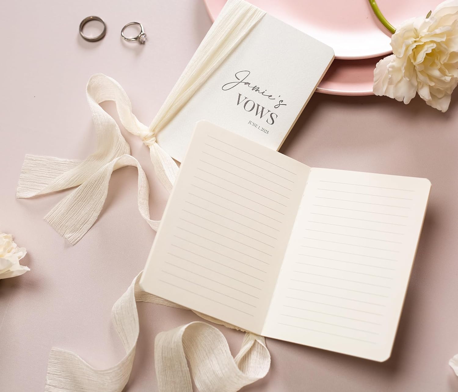 • Each vow book in our set measures 5.625 x 4 x .5 inches, making them pocket-sized for easy carrying. Crafted from high-quality materials, these softcover vow books offer durability with a sophisticated finish. The flowy ivory ribbon adds a touch of romance and softness against the texture of the book.