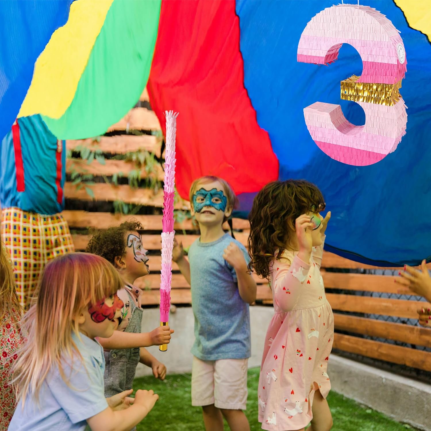 • [Size] Number 3 piñata: 20 x 13.3 x 3 in. Piñata stick: 30 in. The large piñata is more noticeable as a party decoration, the extended stick makes hitting easier and the stick is reusable.