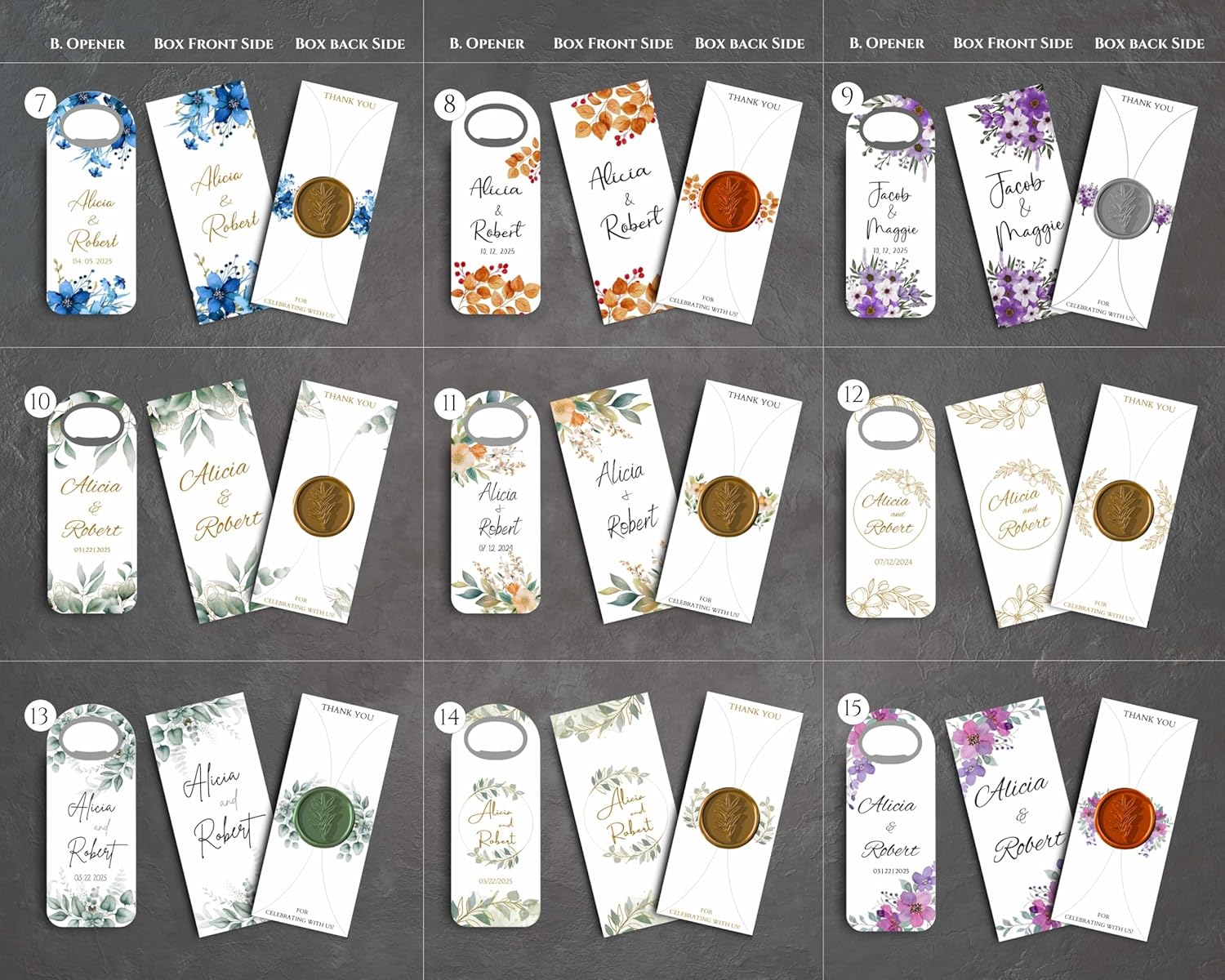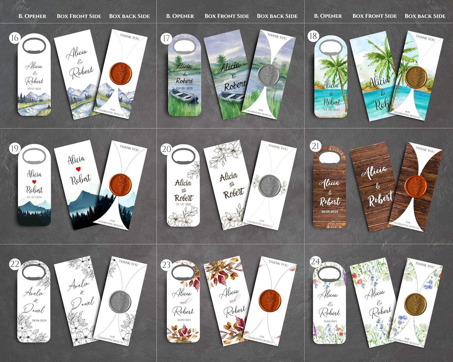 • Customized Keepsakes: Tailored to reflect your personality and wedding theme, including your names and wedding date. They are practical items that guests will cherish long after the event.