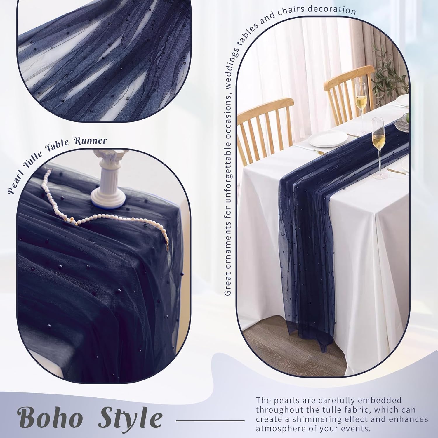 Pearl Table Runner 29 x 120 Inch Tulle Fabric Lace Table Runners Boho Rustic Tablecloth for Bridal Shower Birthday Party Wedding Arch Aisle Veil Dessert Table Decor(1 Pack, Navy Blue)