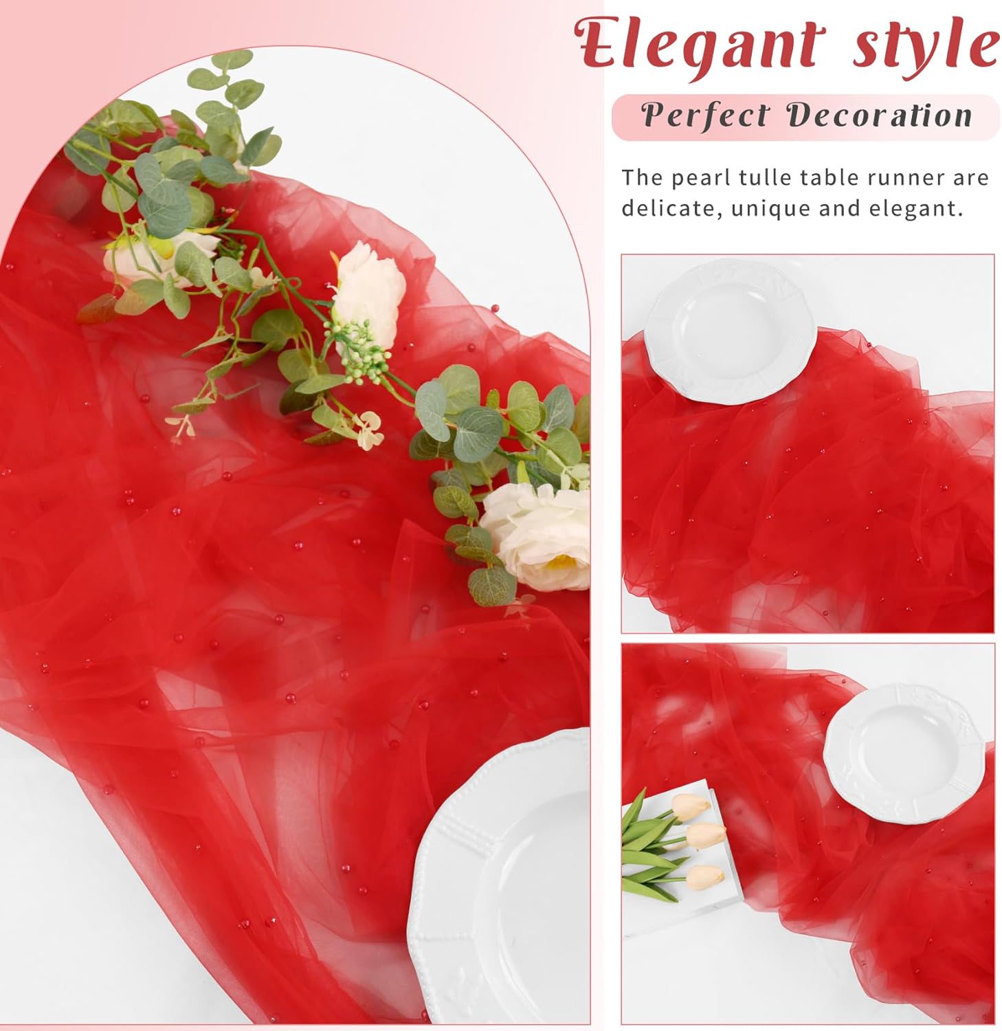 • 【Exquisite Workmanship】 These romantic table runners are made of premium tulle. Soft feeling, sheer, reusable, easy to clean and fade resistant. Delicate pearls embellished table runner works perfectly for many types of event decor, which will add a ton of elegance to any space.