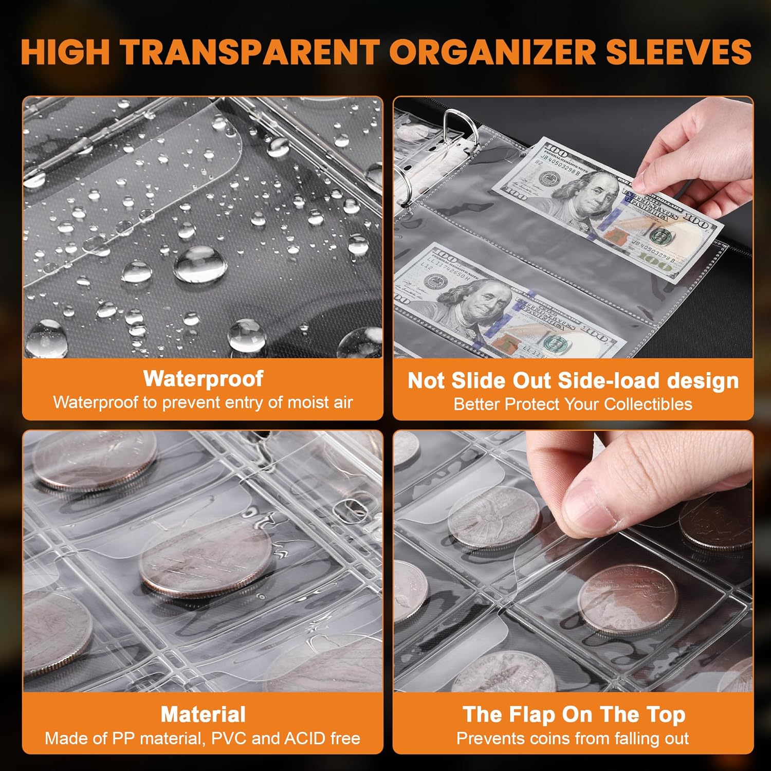 • Coin Album with Double Zipper Closure: Designed from high-quality silicone fiberglass cover, the coin albums for collectors use water-resistant properties. With a double zip closure, this album allows additional items to be stored securely inside without fear of money and coins falling. Thickened transparent pages maintain durability and moisture resistance, while the stainless steel page holder ensures long-lasting strength and prevents damage or fall off