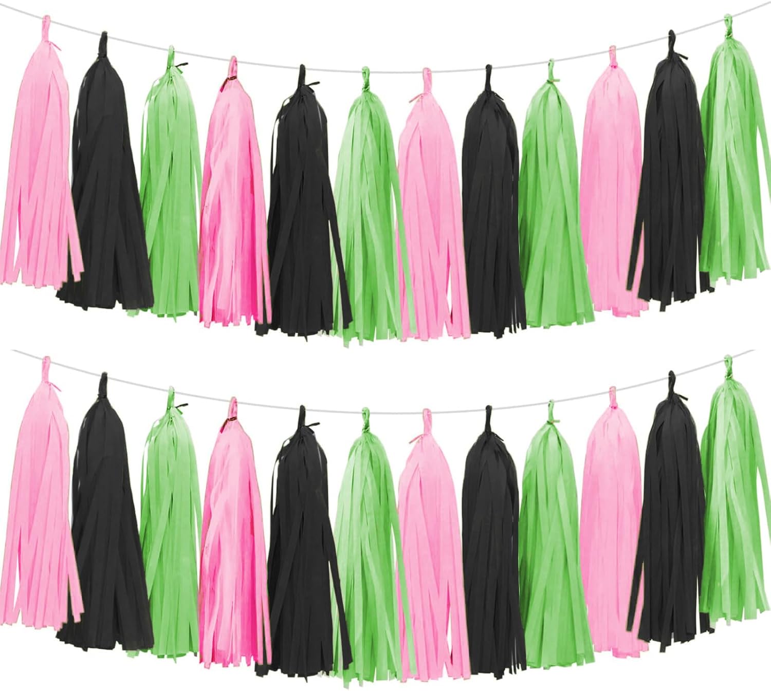 Tissue Paper Tassel Garland Banner, 15 Pack, Pink Green Black, Party Decorations for Birthday, Baby Shower