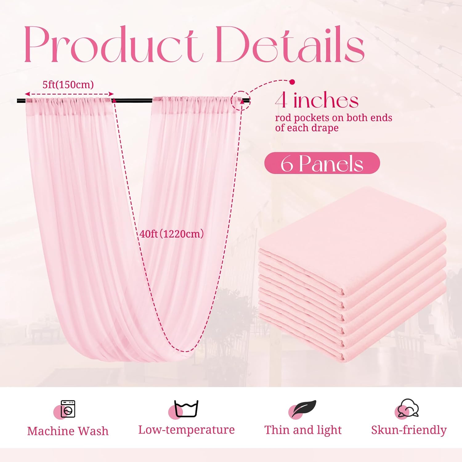 • 【Package Includes】The package will include 6 panels Pink wedding ceiling drapes (Not include stand), each wedding extra long curtain measures 5 feet (60inch)wide x 40 feet(480inch) long.The sufficient quantity can meet your demands for decorating your weddings, parties, receptions.