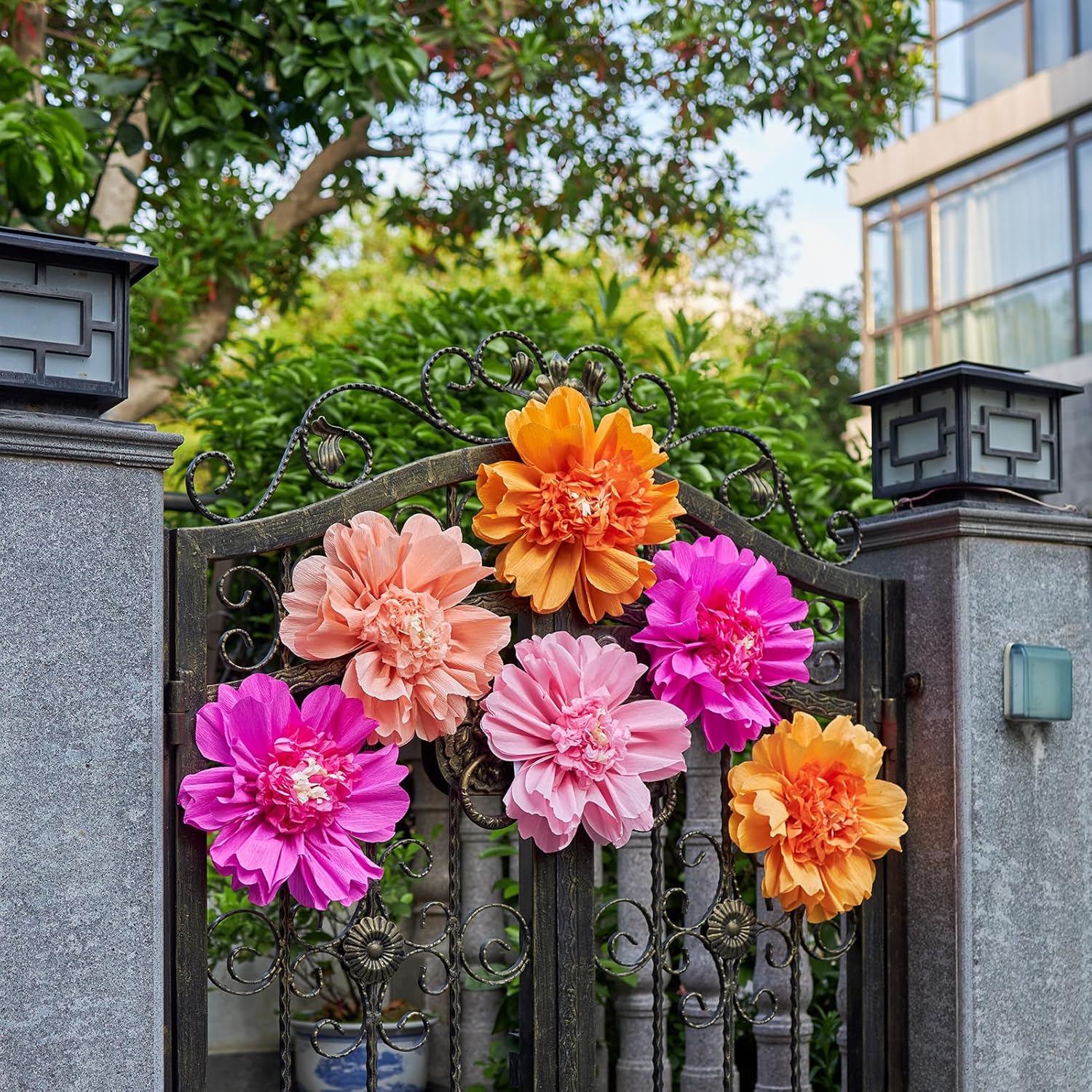 • ๐ŸŒบใ€COMPLETE FLORAL DECORATIONS SETใ€‘: This giant paper flower set includes 6 large paper flowers, offering everything you need to create a complete and vibrant floral display. Each bloom features 12-inch crepe paper petals with a layered tissue paper center in a mix of hot pink, pink, peach, and orange.