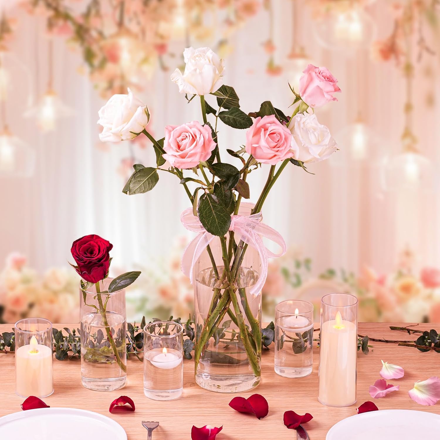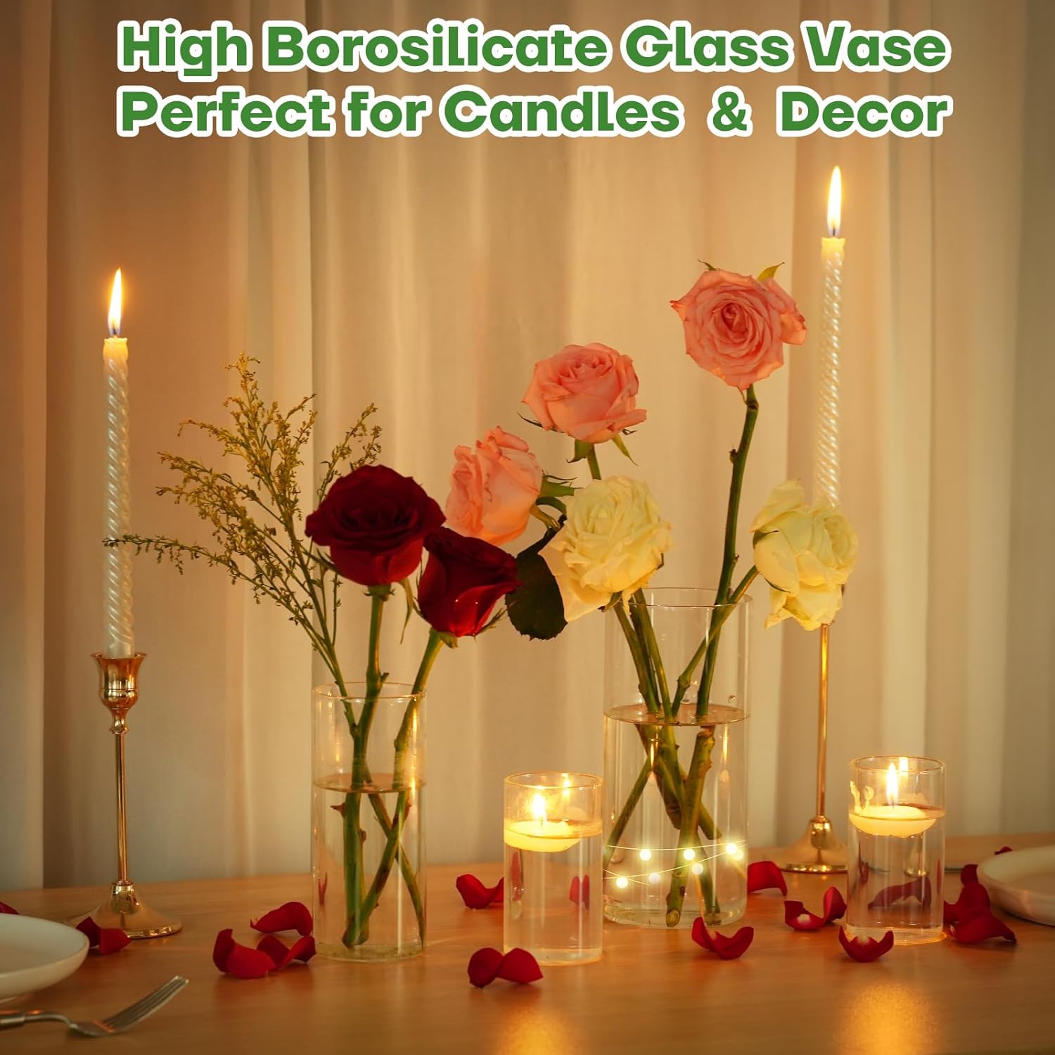 • Candle-Specific Functionality:These glass cylinder candle holders shine as versatile candle vases—perfect as floating candle vases and cylinder vases for floating candles, with sizes (4/6/7.5/10 inch) tailored for both small tealights and medium pillar candles. Crafted from heat-resistant borosilicate glass, they double as safe hurricane vases to shield flames, making them ideal floating candle holders for cozy evenings. The clear design amplifies glow, whether using pillar candles in glass cylinders or floating candles centerpiece set—ideal for date nights, holiday gatherings, or ambient home decor