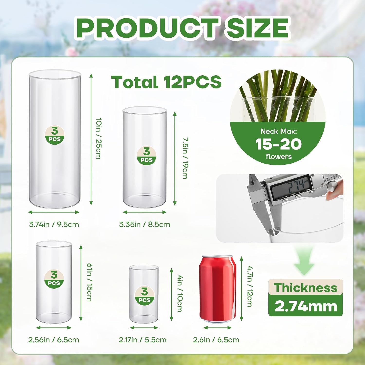 • 12PCS 4-Size Glass Cylinder Vases for Centerpieces: This set includes 12 clear glass cylinder vases in 4 sizes (4"H x 2.2"W, 6"H x 2.6"W, 7.5"H x 3.3"W, 10"H x 3.7"W), with 3 of each size, offering 3 different sized cylinder vases perfect for diverse needs.:flower arrangement,candle vases ((such as floating candle vases or pillar candles in glass cylinders),wedding,home decor,party,office desk decor and more