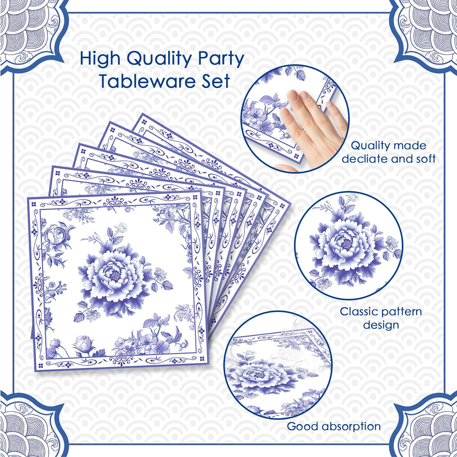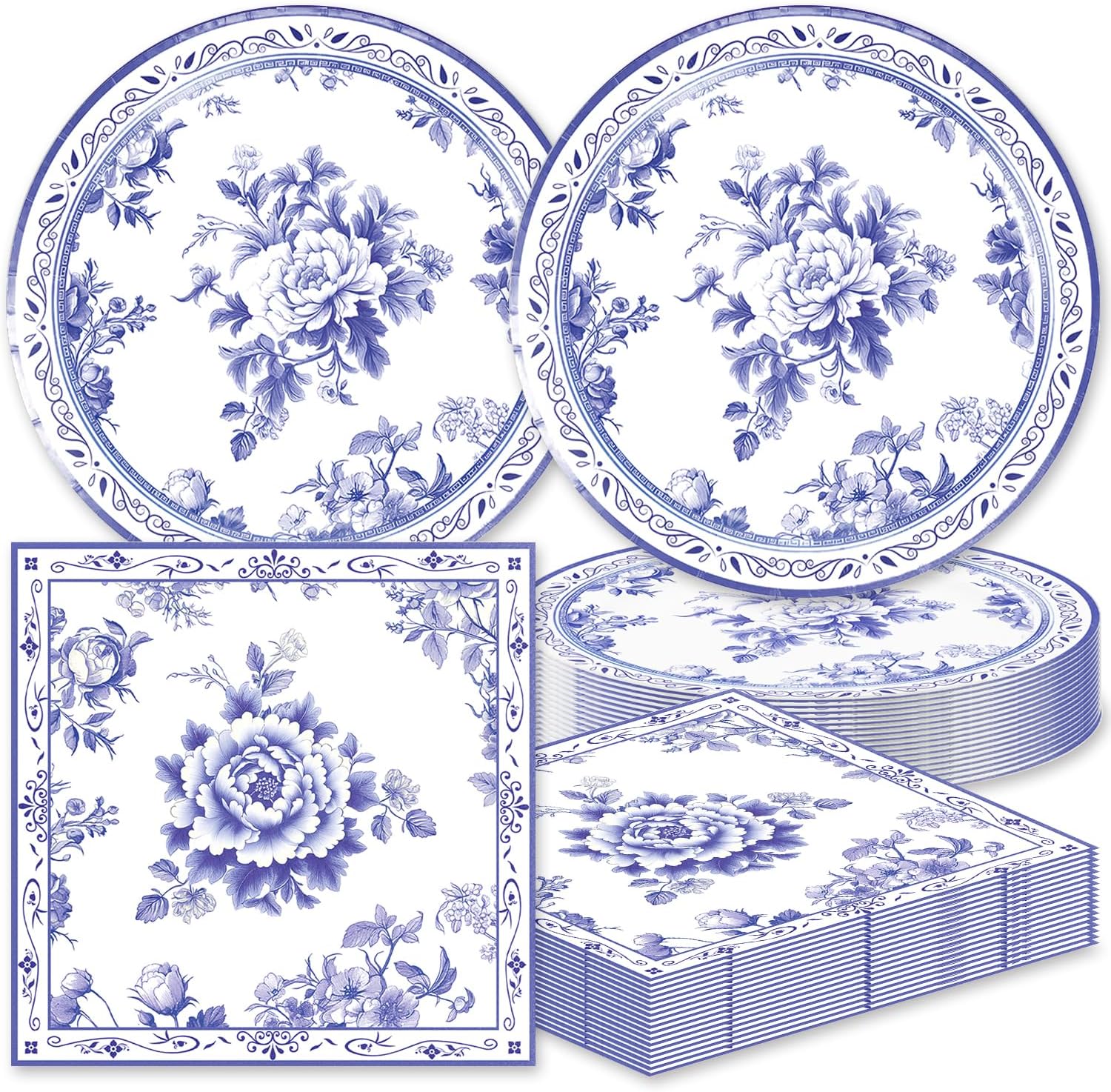 • Package Contents‌: Set includes 20pcs 7-inch Blue Flower plates and 20pcs 6.7x6.7-inch Blue Flower napkins, ensuring you have enough supplies for your guests.Convenient packaging makes it easy to store and transport.