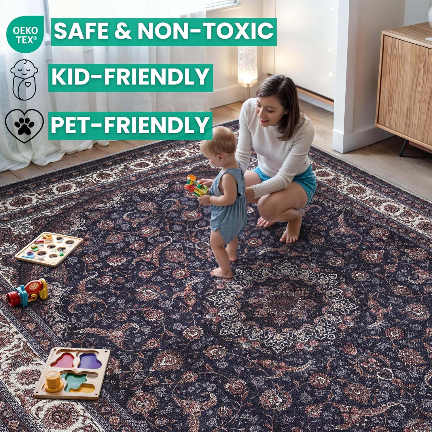 • EASY TO SETUP AND NON-SLIP: This one-piece machine washable rug with non-slip backing attached eliminates any additional setup. Simply unfold and lay flat upon arrival in the desired space. Non-slip backing prevents the rug from moving or sliding without the need for additional rug pad or grippers.