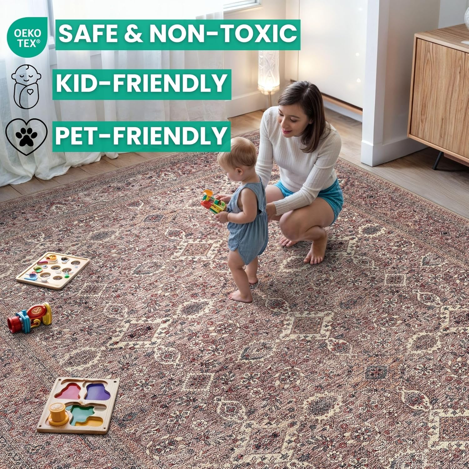 • MACHINE WASHABLE: Machine wash on delicate cycle (do not use bleach) at 85°F (30°C) and line dry or dry on air-only cycle without heat. Vacuum regularly and spot clean small stains. This easy to clean rug is perfect for families with kids and pets, and for high traffic areas.