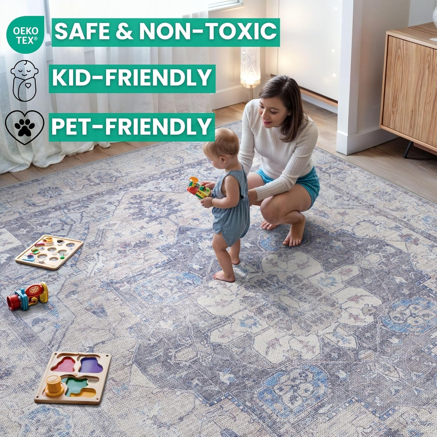 • MACHINE WASHABLE: Machine wash on delicate cycle (do not use bleach) at 85°F (30°C) and line dry or dry on air-only cycle without heat. Vacuum regularly and spot clean small stains. This easy to clean rug is perfect for families with kids and pets, and for high traffic areas.