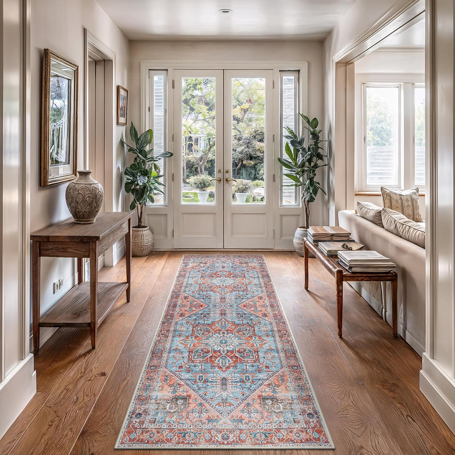 Bloom Rugs Washable Non-Slip 12 ft Runner - Coral/Sky Blue Traditional Medallion Runner for Entryway, Hallway, Bathroom, and Kitchen - Exact Size: 2.5' x 12'