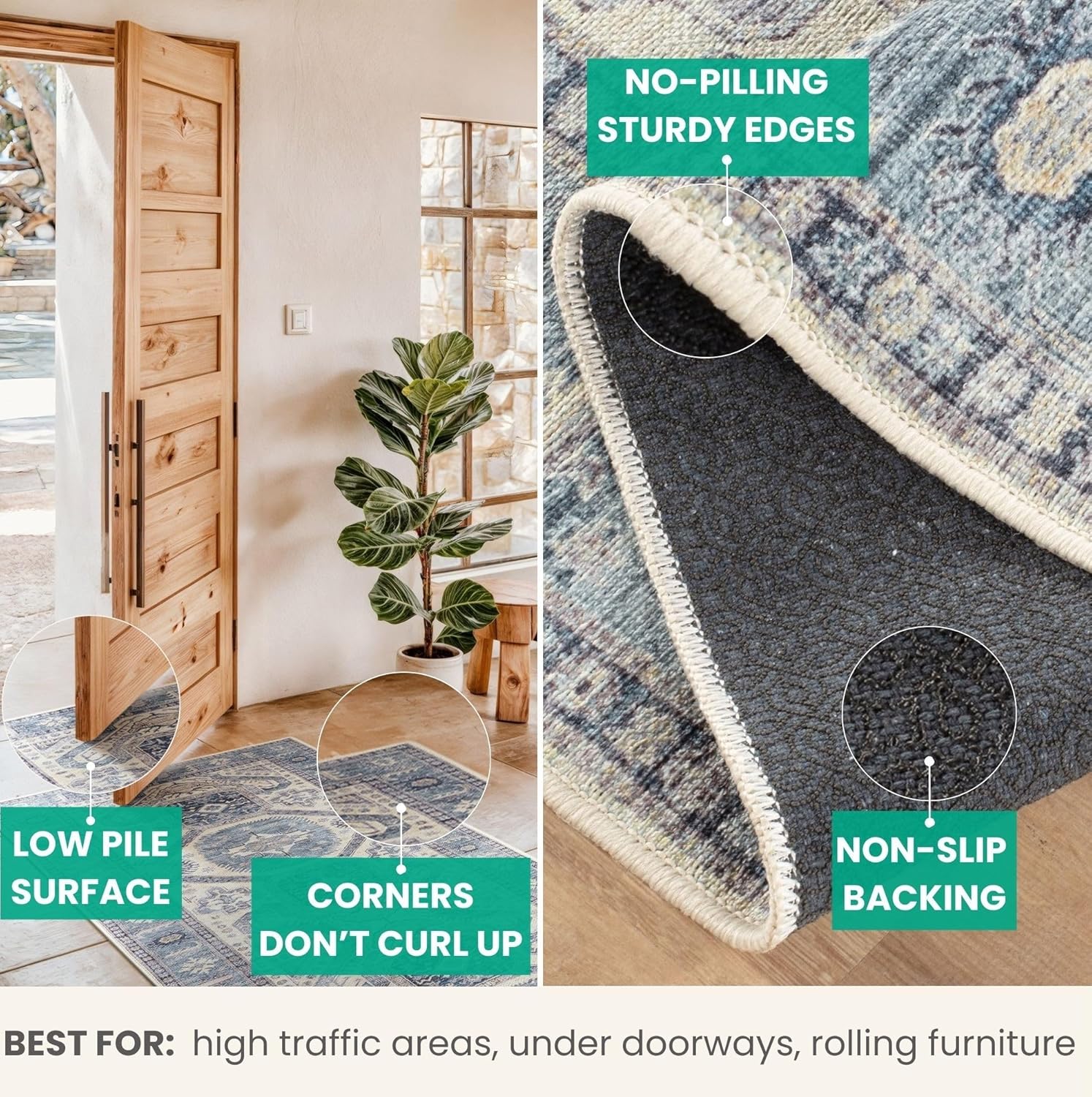 • EASY TO SETUP AND NON-SLIP: This one-piece machine washable rug with non-slip backing attached eliminates any additional setup. Simply unfold and lay flat upon arrival in the desired space. Non-slip backing prevents the rug from moving or sliding without the need for additional rug pad or grippers.