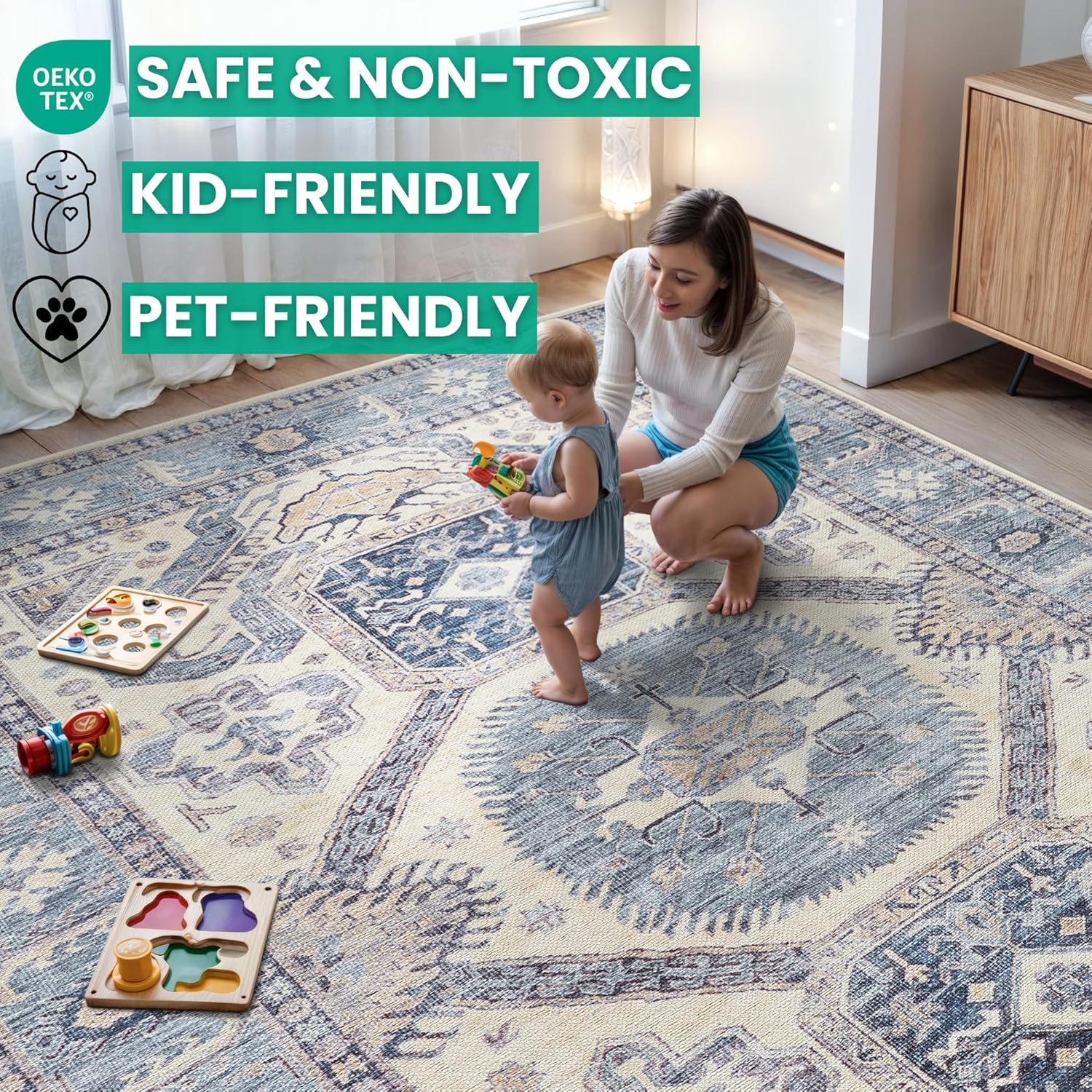 • MACHINE WASHABLE: Machine wash on delicate cycle (do not use bleach) at 85°F (30°C) and line dry or dry on air-only cycle without heat. Vacuum regularly and spot clean small stains. This easy to clean rug is perfect for families with kids and pets, and for high traffic areas.