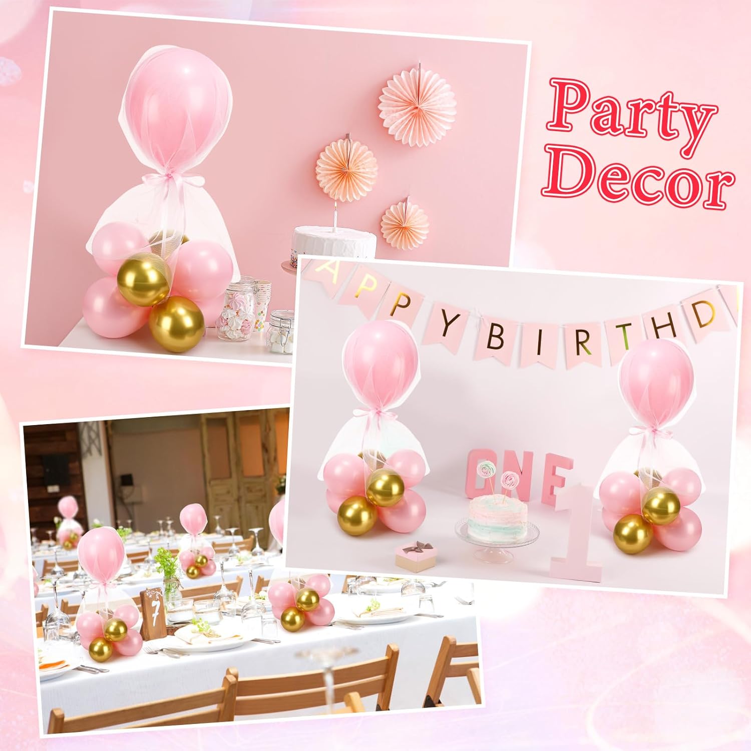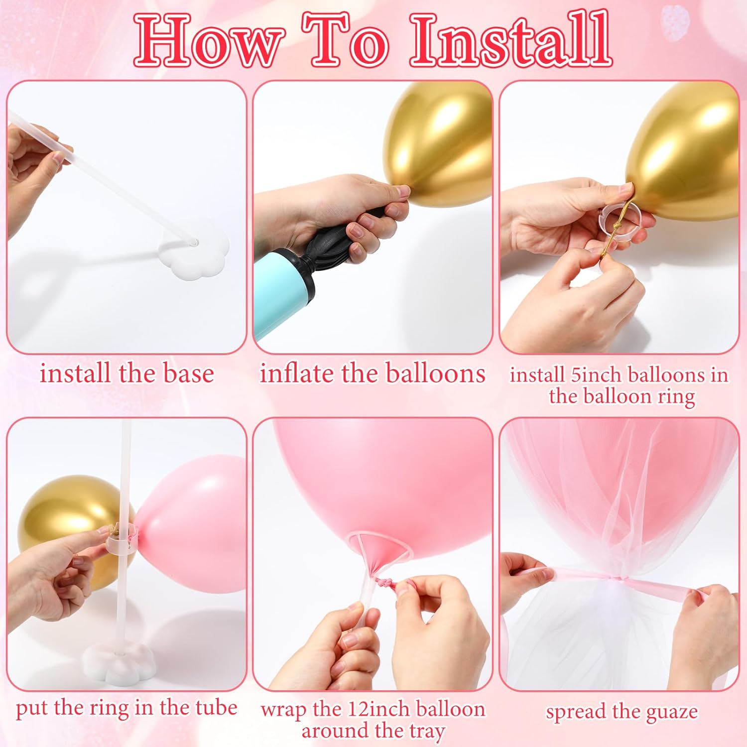 • What You Get: you'll receive a nice value balloon pack that includes 8 reusable tabletop balloon sticks, 8 balloon bases, 16 round snaps, 8 white gauze covers, 8 balloon fixed holders, 72 pieces of 5 inch latex balloons (36 bright pink and 36 gold), 8 pieces of 12 inch macaroon bright pink latex balloons and 8 pieces pink thick ribbons; Please note that the color will be closer to the picture after inflated