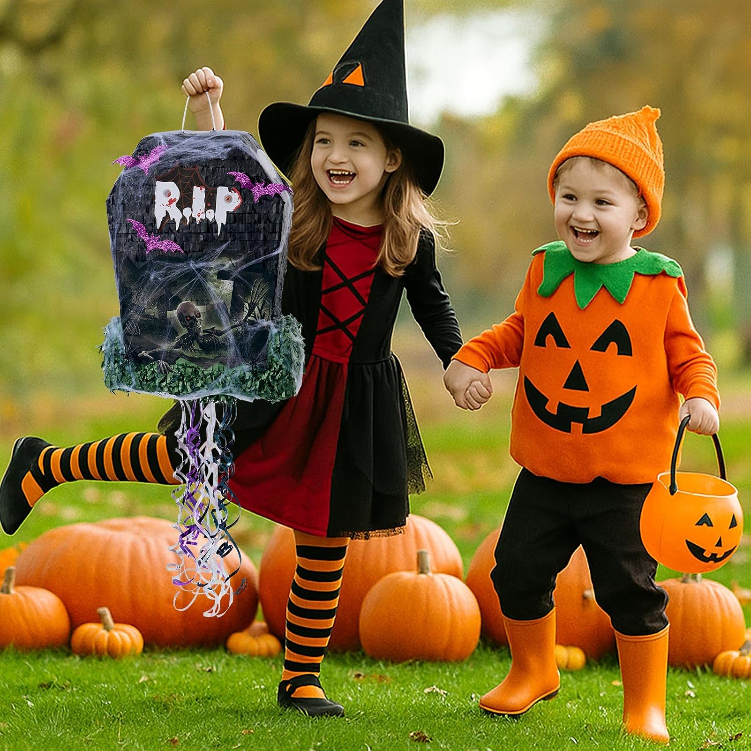 • TOMBSTONE PIÑATA - Spooky Smash Hit! This eerie tombstone piñata oozes haunted vibes with chilling R.I.P. inscriptions & fluttering purple bats. Perfect for Halloween bashes—crack it open to unleash a scream-worthy shower of treats!