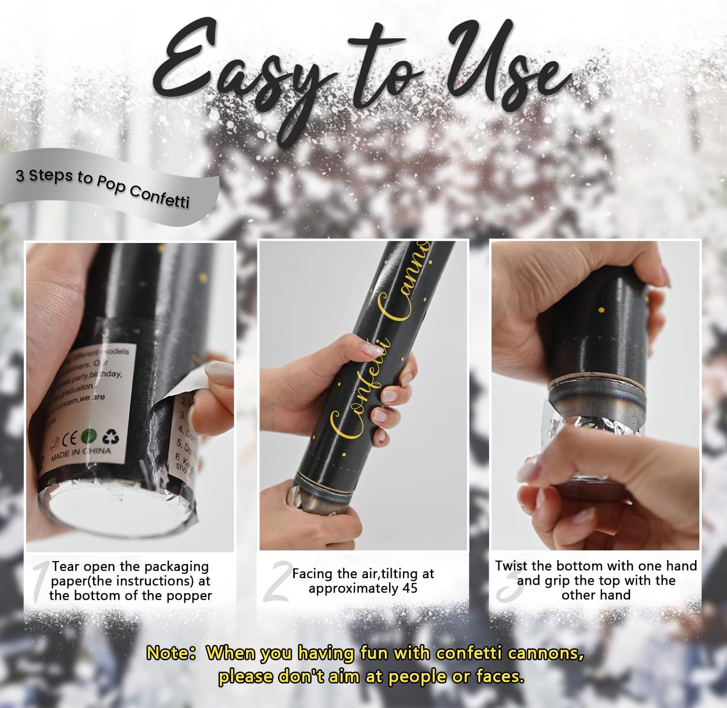 • Easy-to-Use Fun: Experience the excitement of confetti cannon with our simple instructions. Just give the party poppers white wedding confetti poppers a gentle shake, tear the sealed paper for enhanced effects, hold it securely, and twist in the direction of the arrow. Watch as the white biodegradable confetti poppers, adding an extra layer of fun to your celebrations.