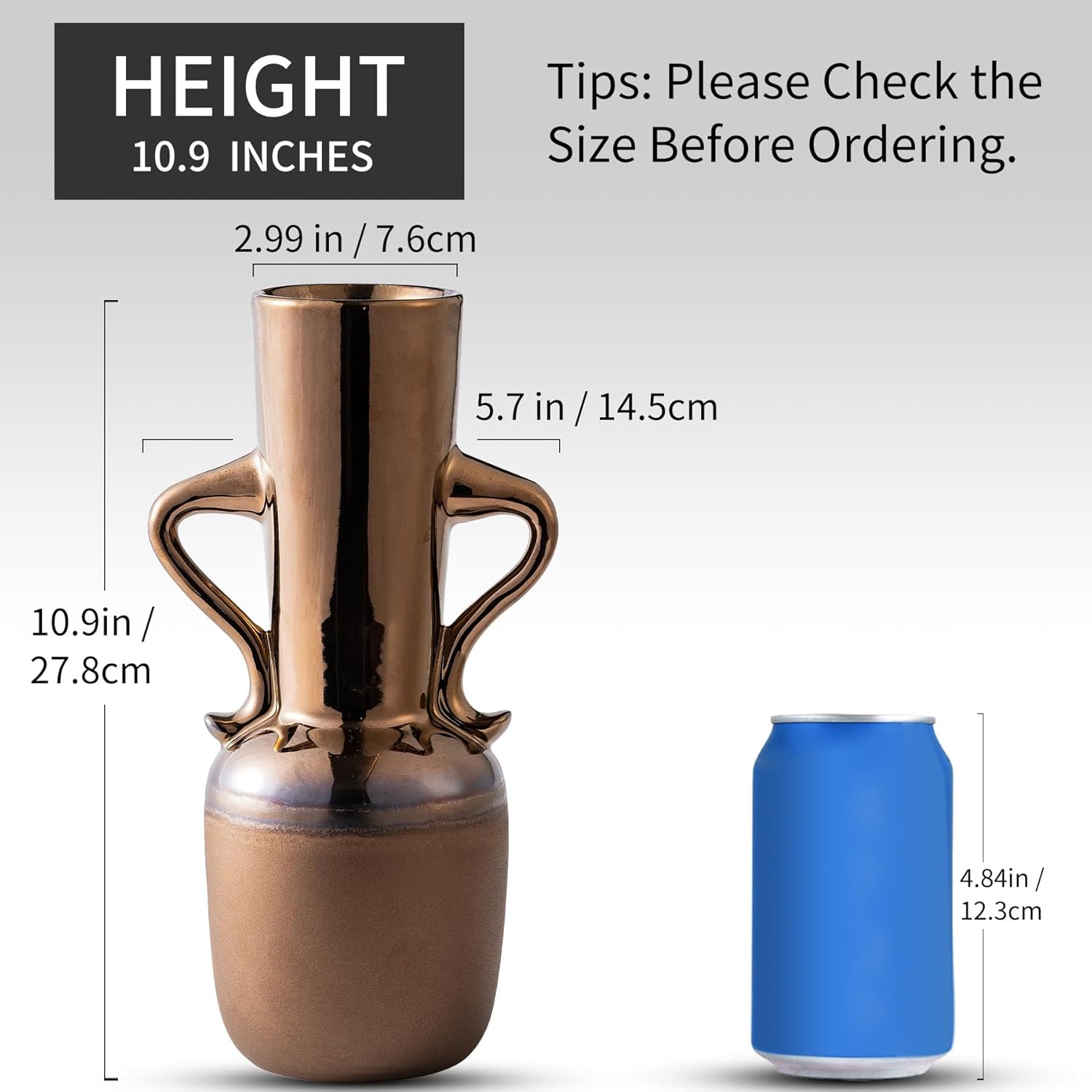 Gold Ceramic Vase with Handles, Brown Rustic Farmhouse Vintage Flower Vases Home Decor, Modern Amber Tall Centerpiece Floral Large Vases for Living Room, Bedroom, Office Metal Glaze Finish 11 Inch