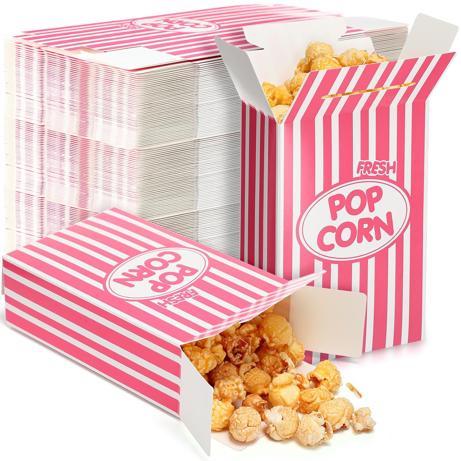 • Pink and White Striped Design: the oil proof disposable popcorn containers are designed with flat bottoms, so they can stand upright on the smooth countertops, besides the traditional red and white striped design conforms to the aesthetic standard of most people, adding joyful atmosphere