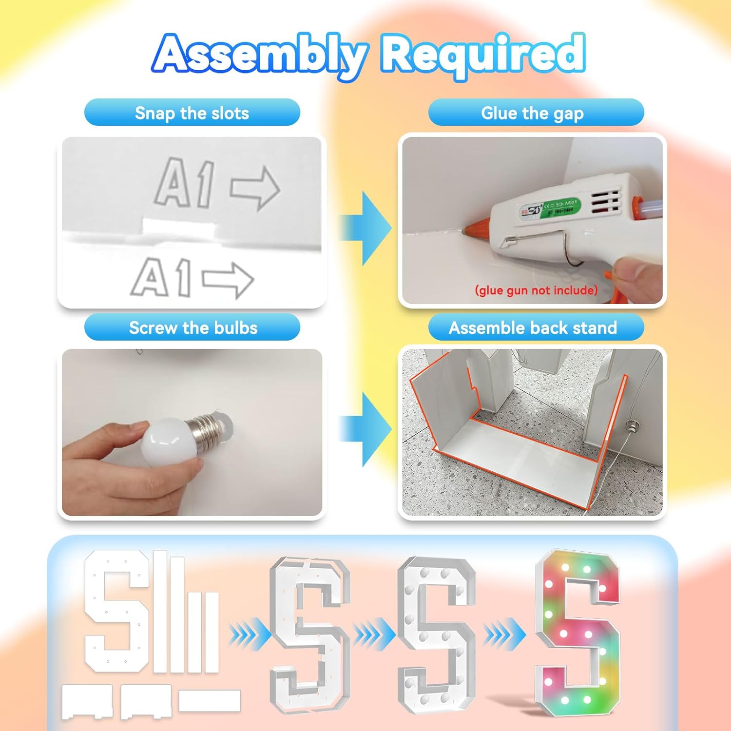 • 【Assembly Required】 4FT Marquee letters are composed of pre-cut foam plates, and also include a remote control, bulbs, and corresponding LED light strings. The product comes with detailed installation instructions and video installation tutorials, making it easy for one person to assemble. When these large light up letters and letters come on, your party can achieve amazing decorative effects.
