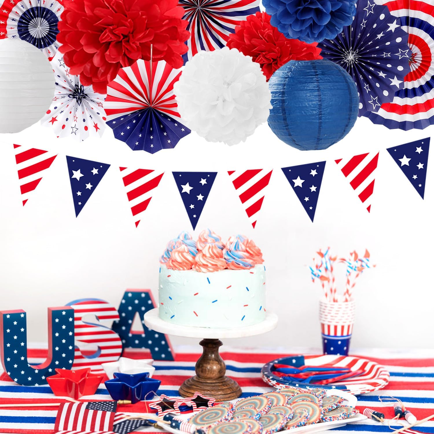 Red-White Blue Memorial-Day Patriotic Decorations - 21pcs 4th Fourth of July Paper Lanterns Fans,Tissue Pom Poms Streamers,Honeycomb Balls,USA Americana Independence Banner Decor Burgleda