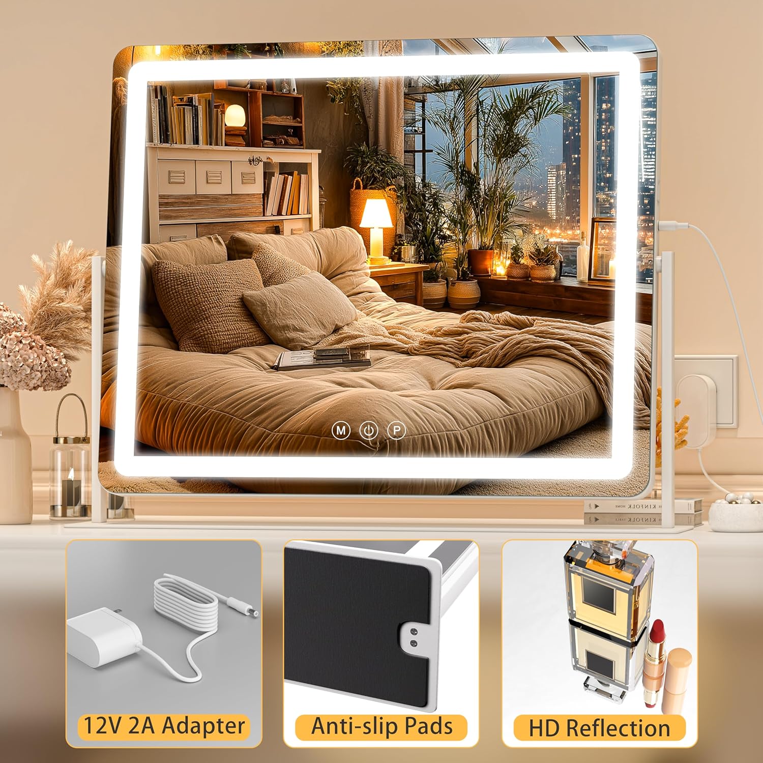 • 【Enhanced Large Size & Minimalistic Rounded Design】 The vanity mirror with provides a perfect upper body view. 360° rotation LED makeup mirror Adjust the mirror's angle effortlessly with its smooth swivel and tilt mechanism, ensuring you achieve the perfect viewing position every time.