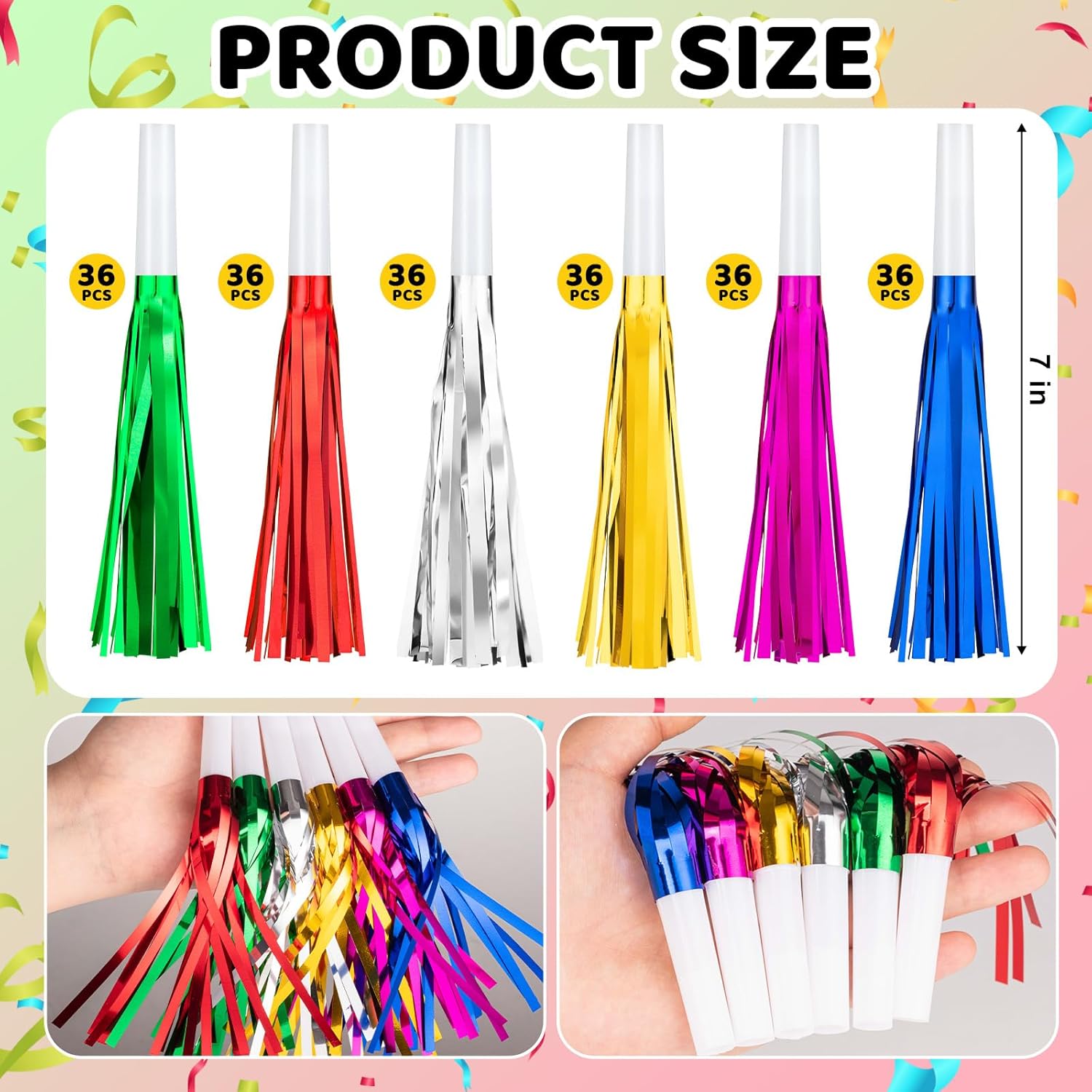 • SAFE TO USE :Our glitter metallic fringed noise makers are easy to use, ensuring a good experience. These party accessories are good for releasing excitement and happiness, creating a lively atmosphere
