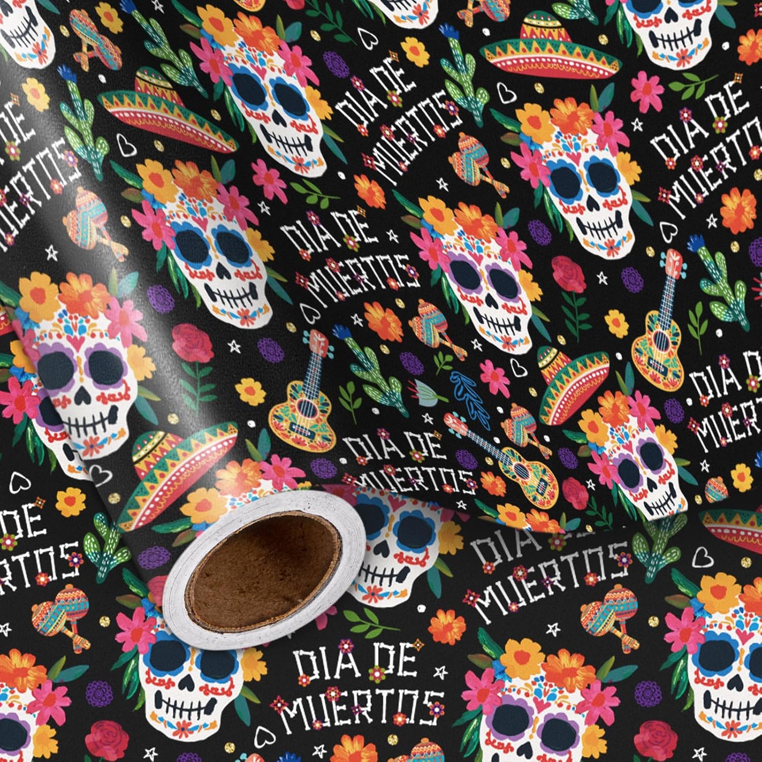LeZakaa Day of the Dead Wrapping Paper Roll, Colorful Sugar Skulls Maracas Flowers Sombreros Design, Día de Muertos Gift Wrap in Black, Mini Roll 17 in x 16.4 Ft