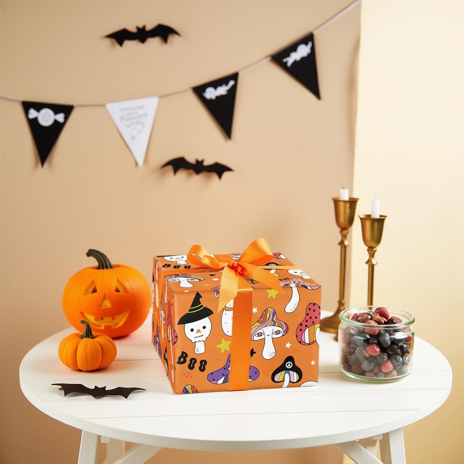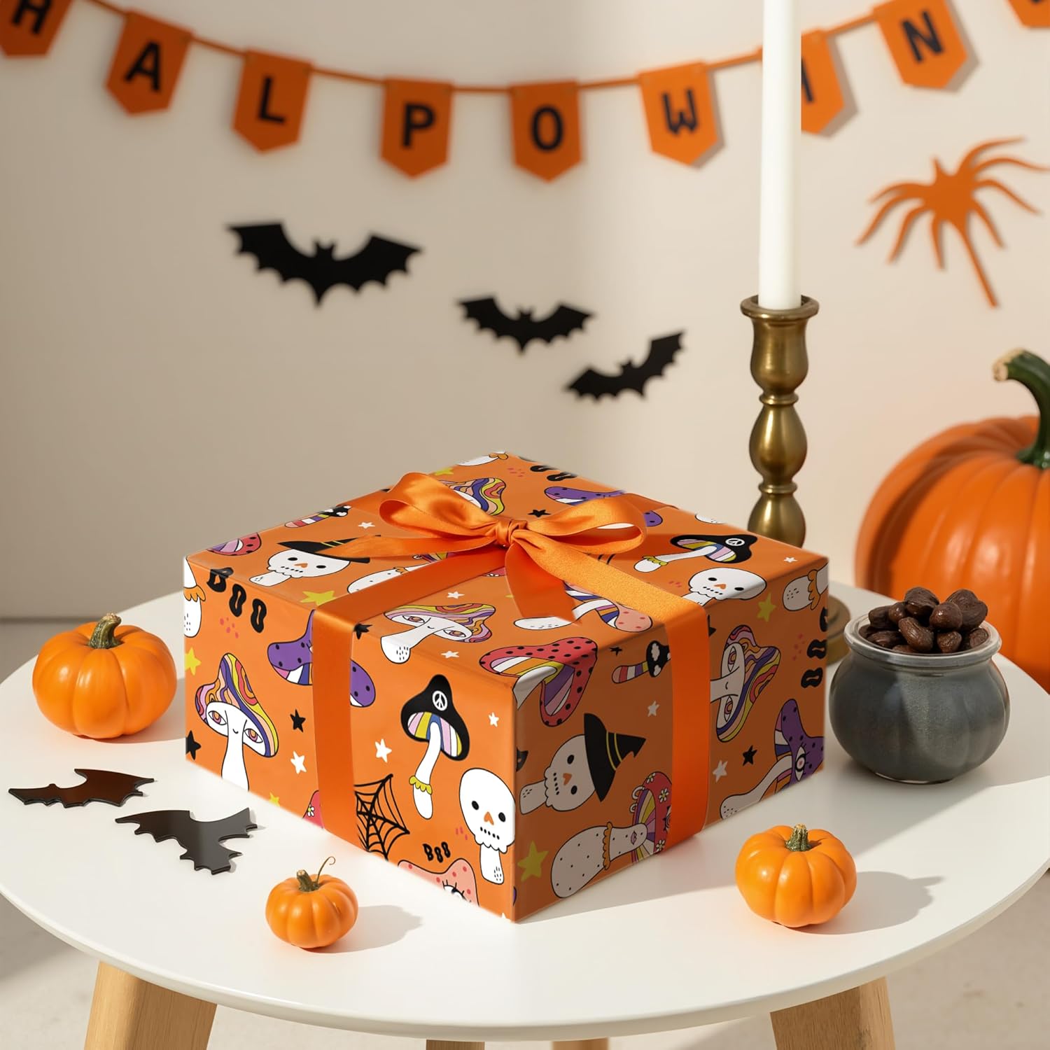 • Halloween Creepy Mushroom Wrapping Paper: Features colorful mushrooms with eyes, skull heads, peace signs, witch hats, spider webs, stars, and β€œBOO” text on a bold orange backgroundβ€”perfect for a spooky and surreal vibe.