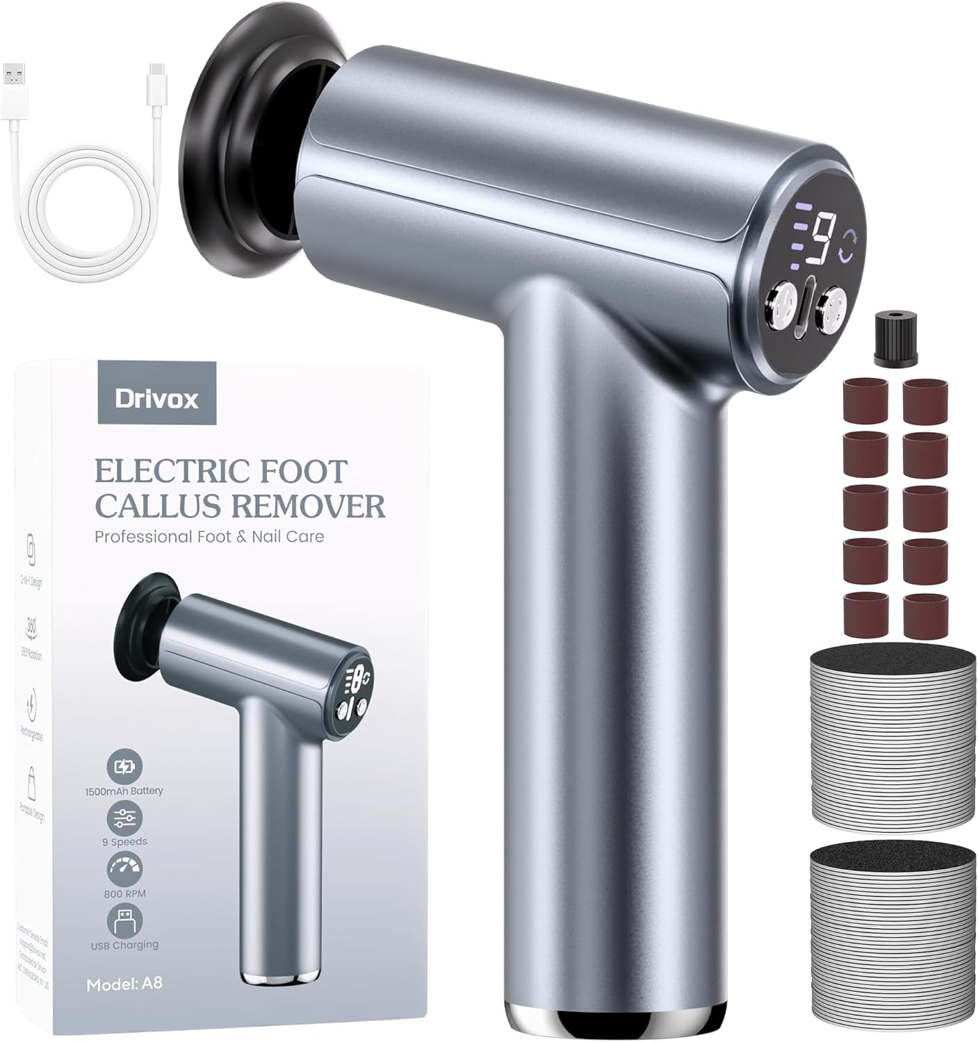 • 【Rechargeable Callus Remover For Feet】Drivox electric foot callus remover built-in 1500mAh lithium battery, provides more than 150 minutes of continuous working time, fully charged in 2 hours. The compact cordless design is perfect for bathroom, salon or travel use