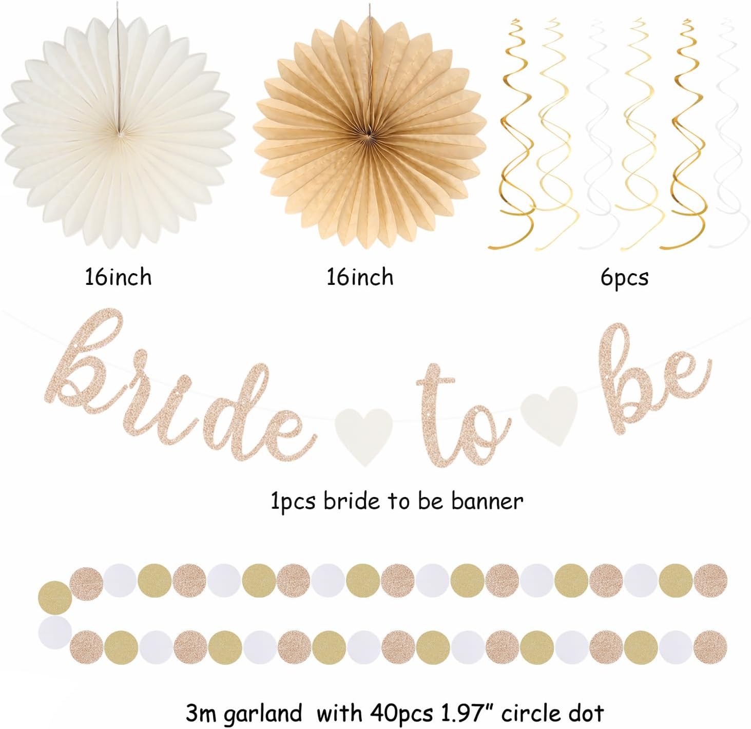 • 【Champagne Gold Beige Blush Pink Party Decorations kits】This kits include 1pcs bride to be banner, 1pcs circle dots paper banner, 4pcs tissue flower pom poms: 3pcs 10" and 1pcs 12" , 3pcs 8inch paper honeycom ball, 2pcs 8inch paper lantern, 4pcs 12inch paper fan, 6pcs Paper swirls hanging streamers