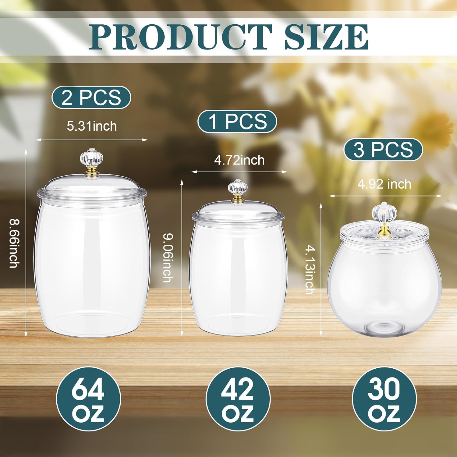 • Cleanliness Simplified: cleaning these plastic apothecary jars with lids is a breeze; Their smooth surface doesn't allow residue to stick, making them easy to clean; Just wash them with soapy water and rinse; The open mouth design also provides easy access to the inside, taking the fuss out of maintenance; Please avoid using abrasive cleaners or tools to maintain its clarity and appearance