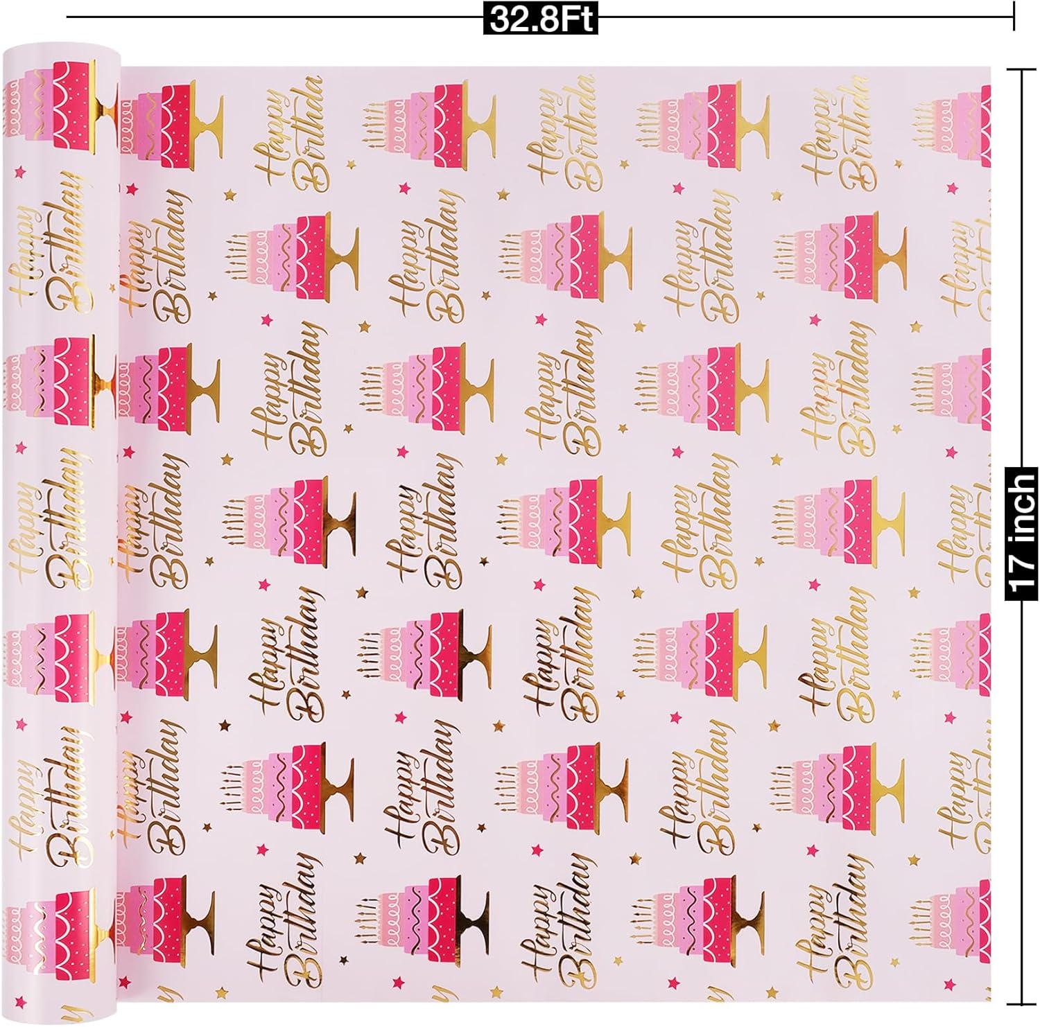 Aimyoo Pink Birthday Wrapping Paper Roll - 17 Inch X 32.8 Feet - Gold Foil Celebration Cake, Happy Birthday Lettering Design Gift Wrap for Kids, Baby Showers