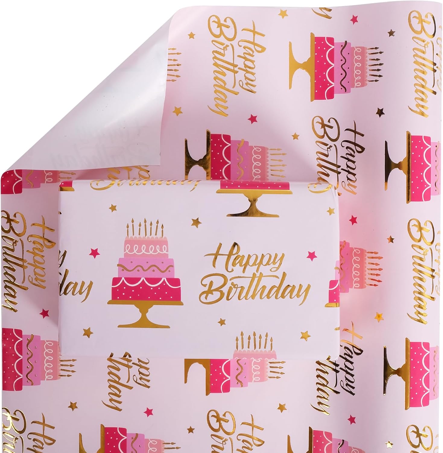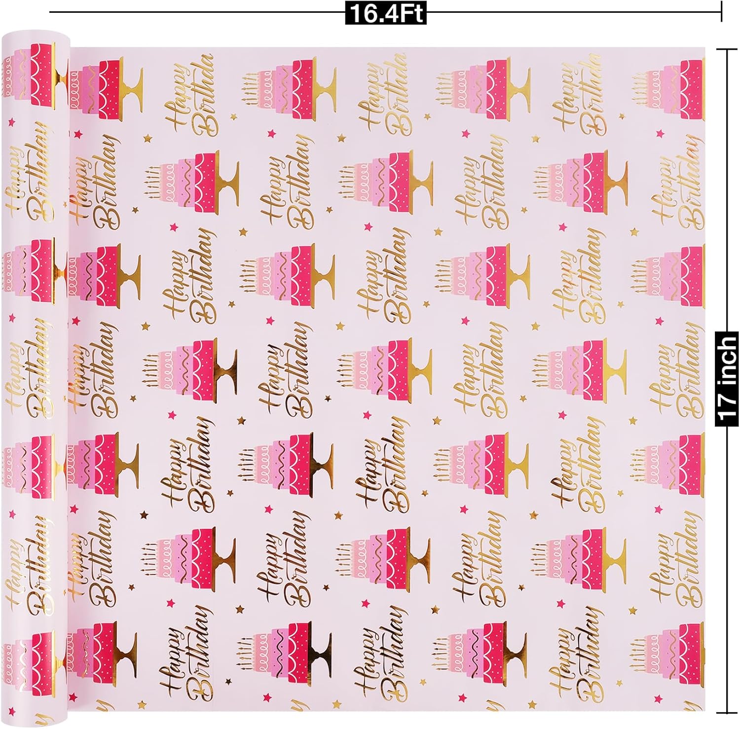 Aimyoo Pink Birthday Wrapping Paper Roll - 17 Inch X 16.4 Feet - Gold Foil Celebration Cake, Happy Birthday Lettering Design Gift Wrap for Kids, Baby Showers