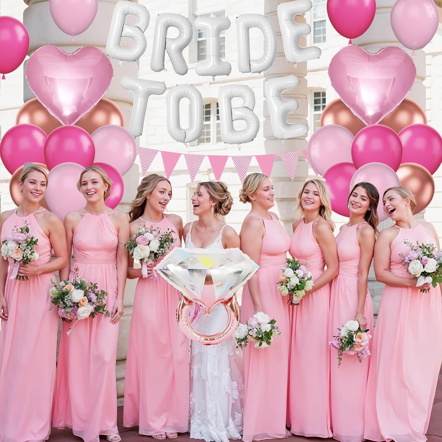 • Bachelorette Party Decorations: The rose gold and pink bachelorette party decorations includes white "BRIDE TO BE" letters balloons, pink foil heart balloons x 2, 12inch latex balloons (baby pink x 5, hot pink x 5, metallic rose gold x 5), diamond ring balloon x 1, pink banner x 1, glue point x 20, balloon ribbon x 1. Pink white and rose gold wedding decorations can be used as background decorations for the bride and friends and family.