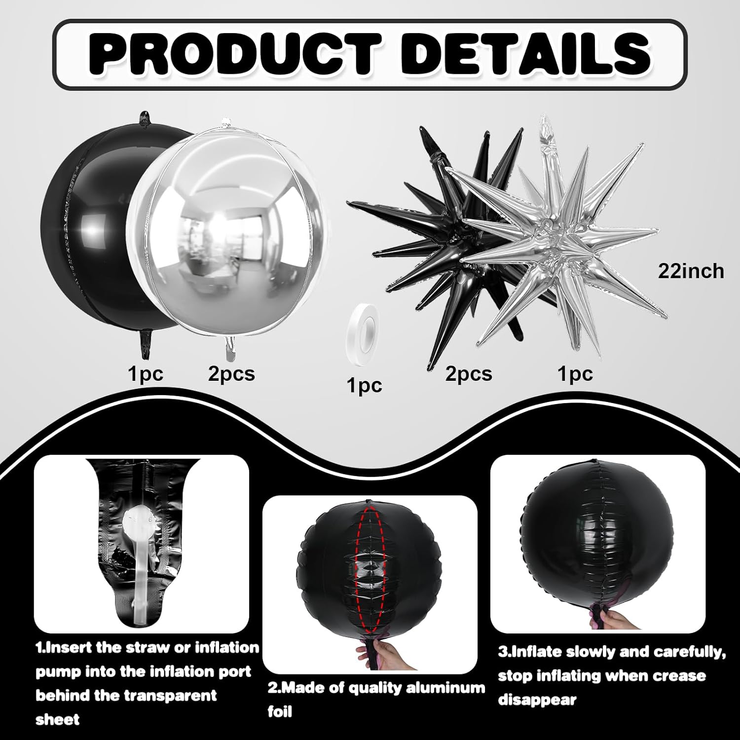 • 【Package】The package includes 3pcs 22Inch 4D ball foil balloons(black x 2,silver x 1),3pcs 22Inch star foil balloons(black x 1,silver x 2),and ribbon.These huge balloons can help you decorate your party better.