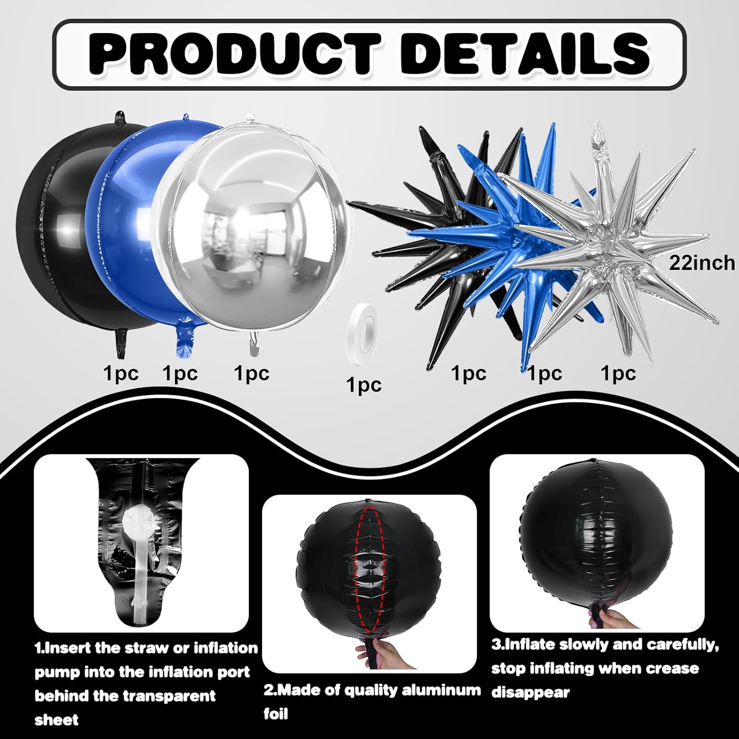 • 【Easy Use】Our blue black silver foil balloons are easy to inflate. The straw inside the package can help you inflate the balloon. After inflation, you can pinch your fingers to the position of the inflation to automatically seal it.