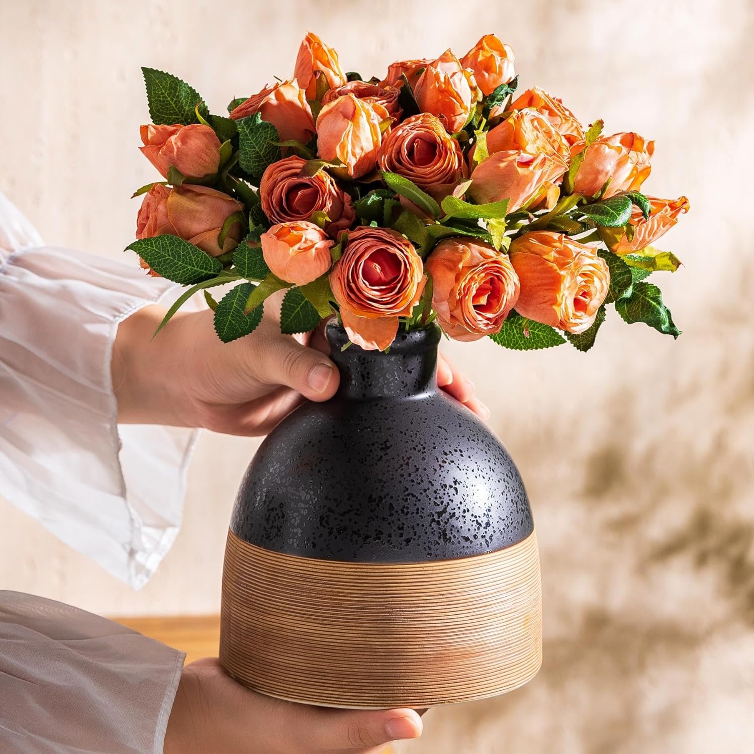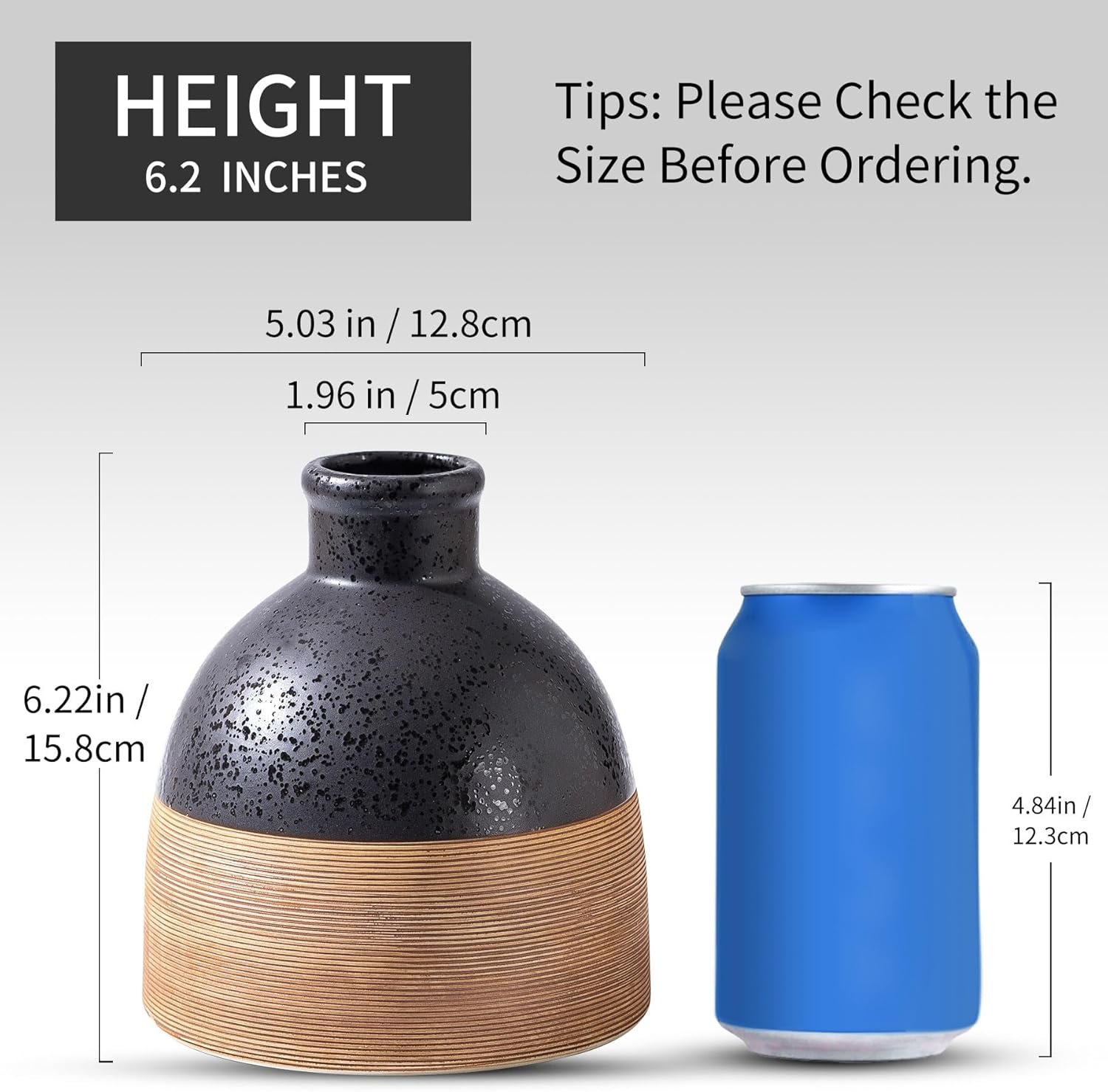 • 【Hemispheric Two-Tone Striped Design & Rustic Charm】SURE YUESI round ceramic vase features a unique half-black, half-brown horizontal striped hemispheric silhouette (6.5x5.7x5.4 Inch), blending modern geometry with rustic farmhouse aesthetics. Perfect as mantle decorations, cottage core table centerpieces, or black living room decor accents.