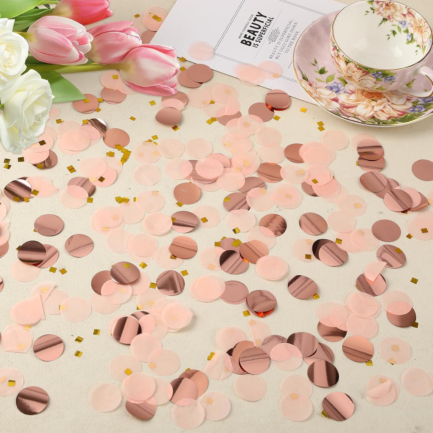 • Package Content: Rose gold tissue paper confetti, the size is 1 inch/2.5 cm. Beautiful colors can easily meet your decoration needs at large or small parties. You can also share these table confetti with friends and family, so that the joyful atmosphere can spread on more occasions and every celebration moment is full of color and vitality