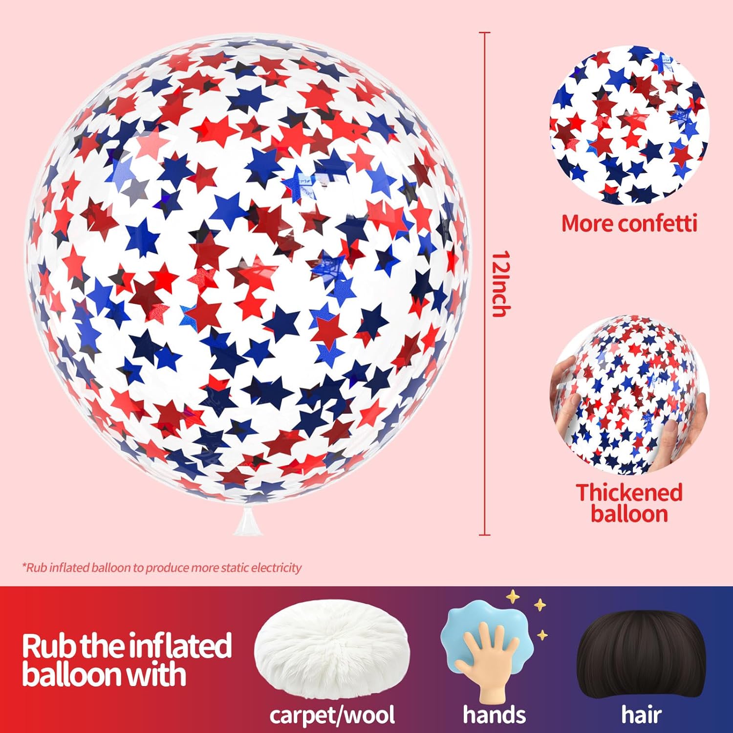 VHUWE 25 Pcs Blue Red Star Confetti Balloons, 12 Inch Clear Latex Balloon with Confetti Inside for 4th of July Decorations Birthday Party Baby Shower Graduation Engagement Decorations Supplies