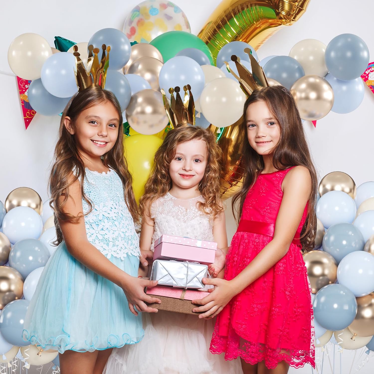 • Curated Twilight Color Palette : 100 premium 12” dusty blue and gold balloons kit (30 retro dusty blue balloons, 25 fog pastel blue balloons, 25 sand white balloons, 20 metallic champagne gold balloons) + 2x 33ft ribbons. Create ethereal boho arches or photo walls!