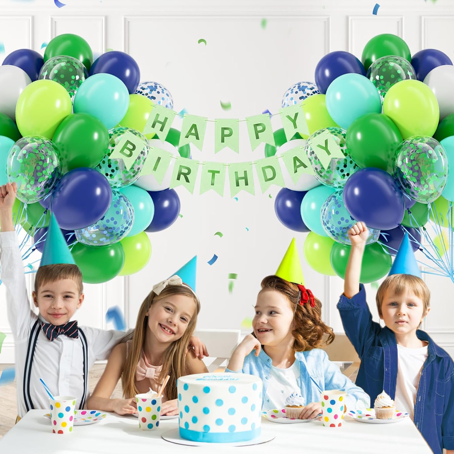 60pcs Blue and Green Balloons 12inch, Navy Blue Lime Green Teal White Confetti Balloons for Dinosaur Baby Shower Birthday Party Decorations