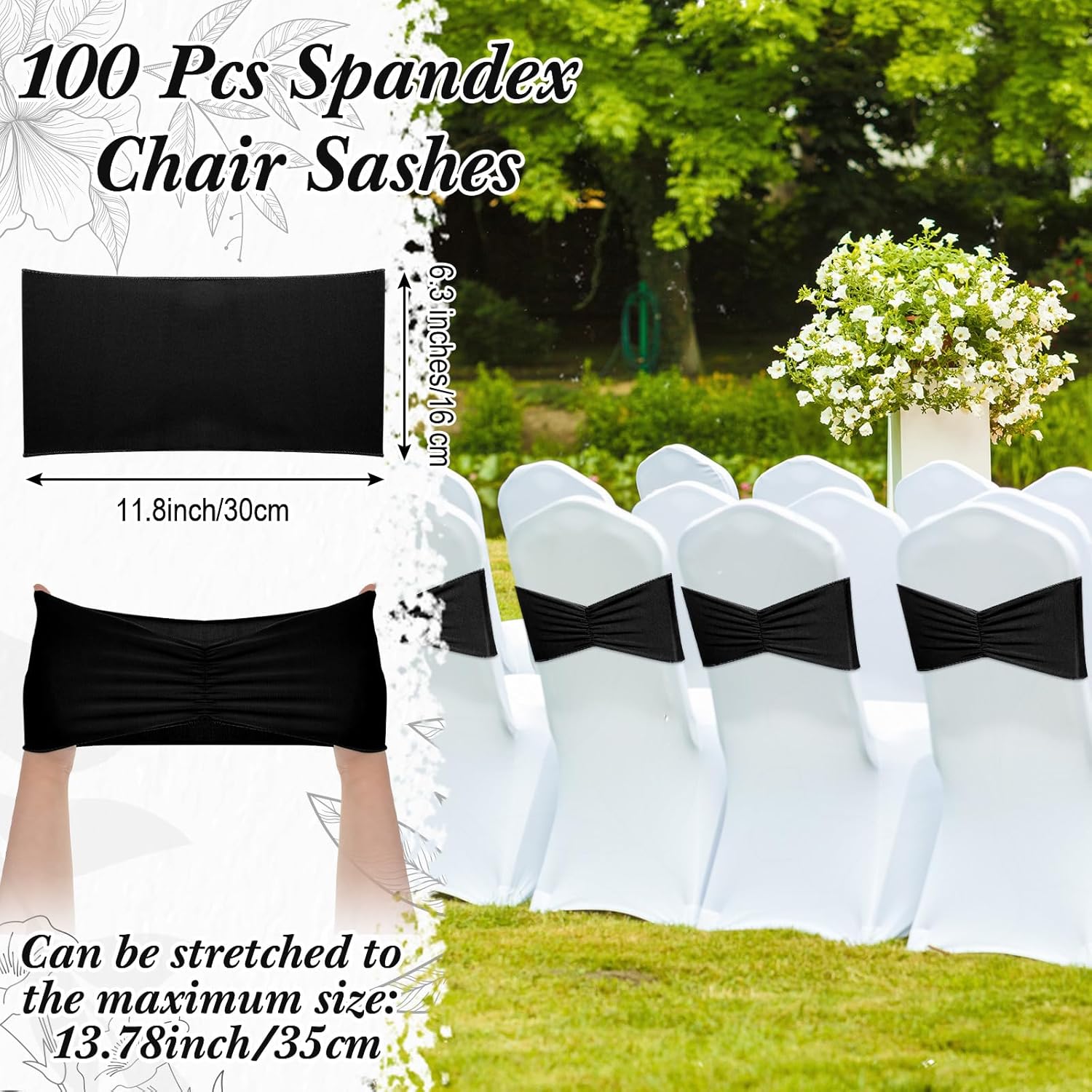 Moukeren 100 Pcs Spandex Chair Sashes Bows Bands Slider Sashes for Chair Covers Elastic Bands Ties Ribbon Decorations for Wedding Party Events Ceremony Birthday Banquet(Black)
