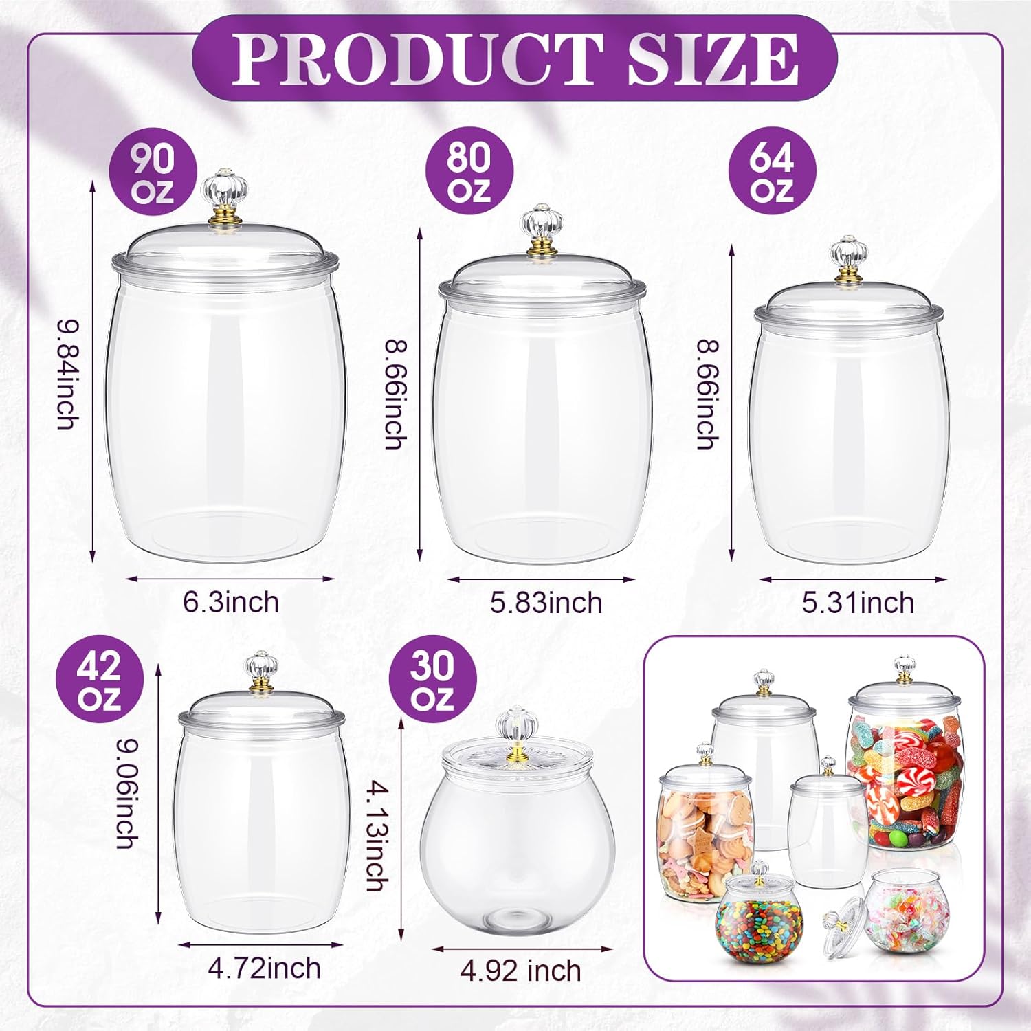 • Size and Capacity: the brilliant design of these plastic candy jars boasts a size of about 90oz, 80 oz, 64 oz, 42 oz, 30 oz in capacity; This space saving feature enables you to store up to kinds of your favorite sweets or snacks, fitting well on your kitchen counter or dining table