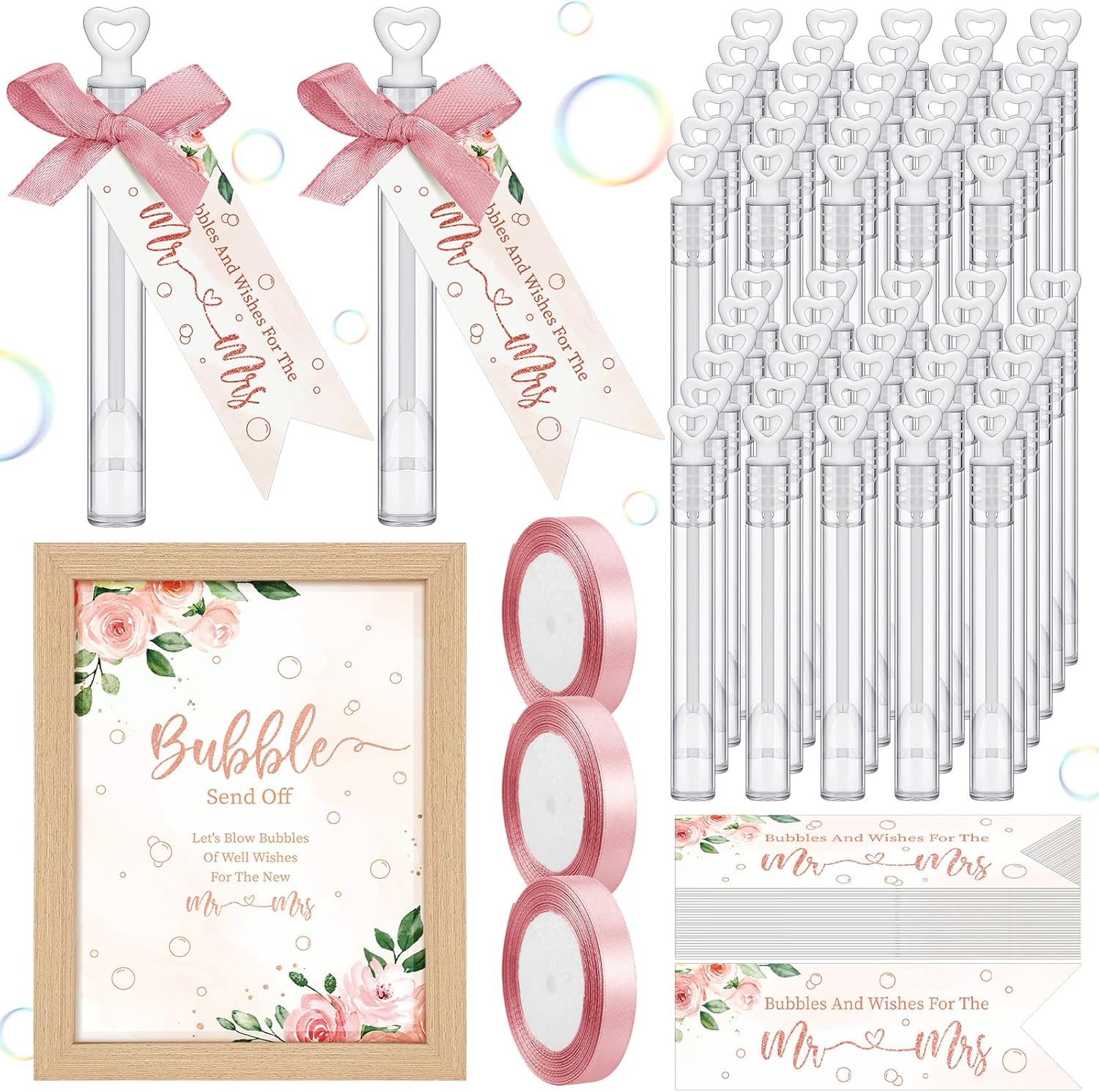 • Wedding Send off Bubbles: the wedding bubbles set contains 200 white heart mini bubble wands, 200 gift tags, 1 bubble send off display card, 1 wood color photo frame and 3 rolls of rose pink ribbon, nice for wedding party favors and wedding farewell bubbles