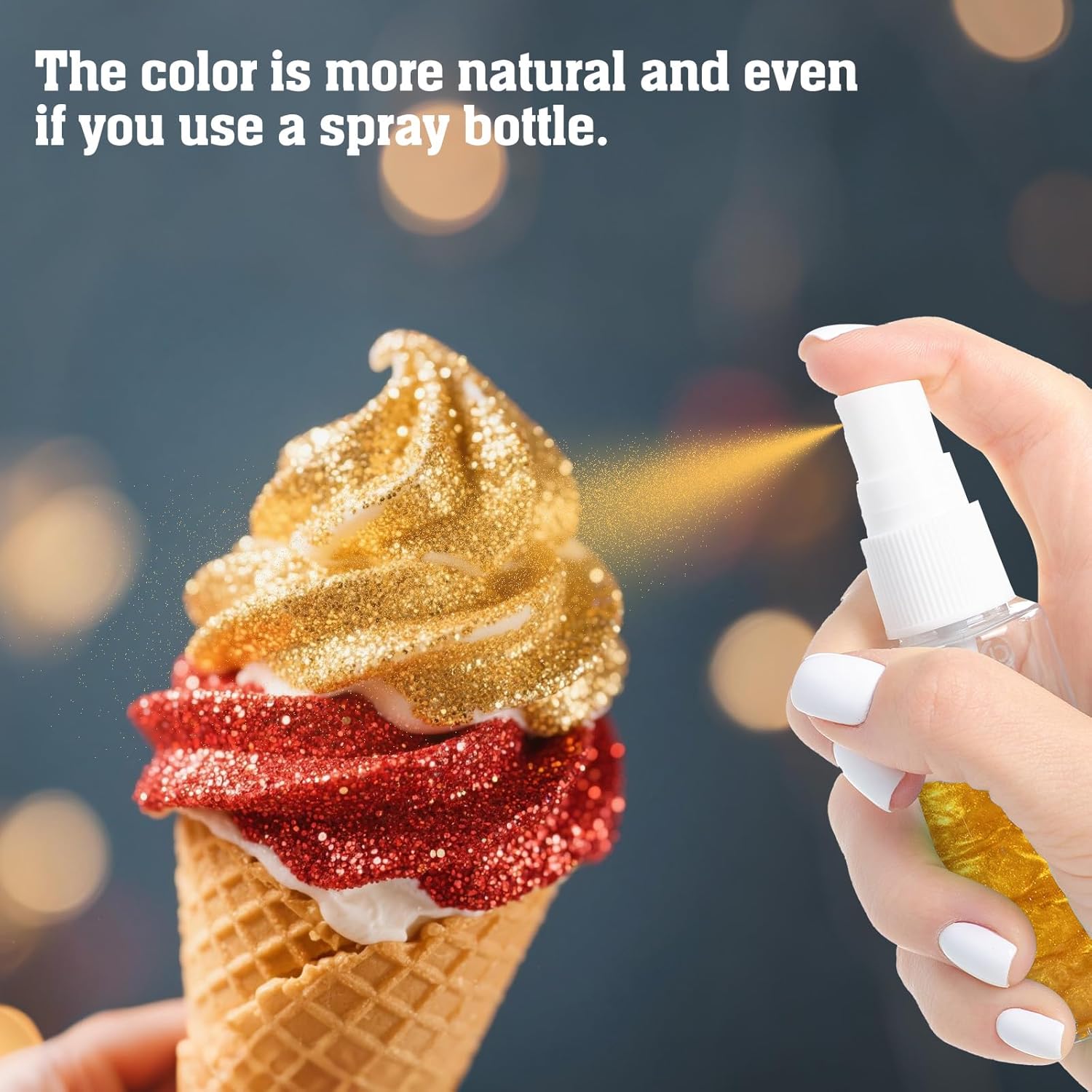 • 【Easy to Use & Versatile】: The edible glitter can simply apply dry with a brush, or mix with alcohol, lemon extract or oil-based flavorings for spray or brush application, or even mix into beverages. These edible luster dust is perfect for decorating frosting, fondant, whipped cream, cocktails, mocktails, champagne, and chocolates with a stunning Iridescent shimmer effect.