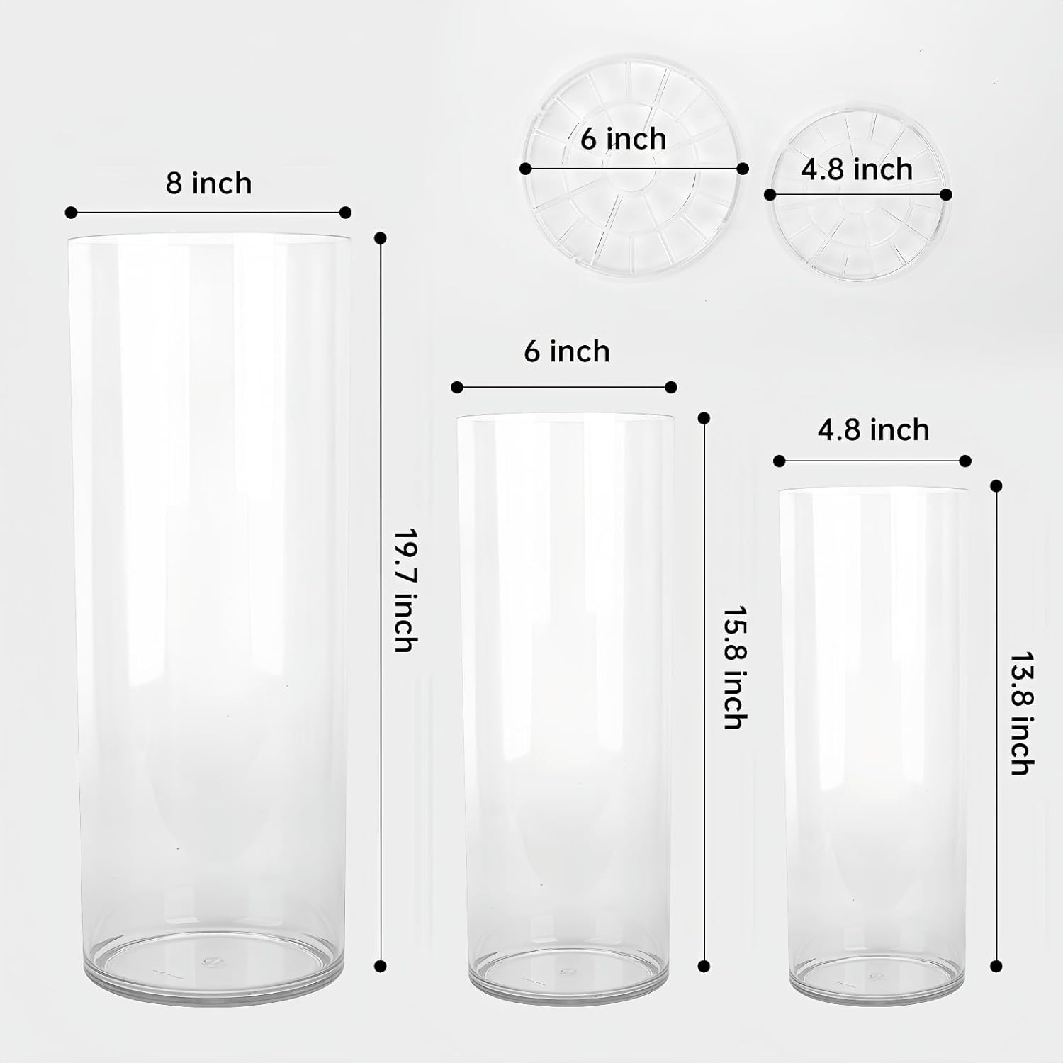 Extra Large Acrylic Cylinder Clear Vase for Floor, Tall Big Wide Mouth Plastic Unbreakable Hurricane Flower Vases of 3 for Home Decor (D 8" X H 19.7", D 6", D 4.8" + 2 Holder)