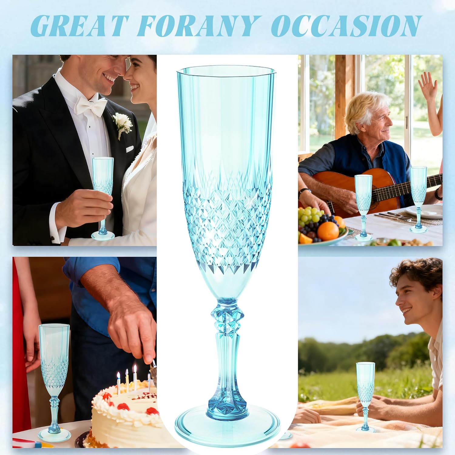 • Charming Set: Champagne flutes set include 48 retro-style light cyan blue champagne plastic wine glasses, providing ample quantity to meet your daily use and replacement needs. A suitable champagne cup is the icing on the cake. Plastic wine glasses not only carry the wine, but also carries the laughter and blessings