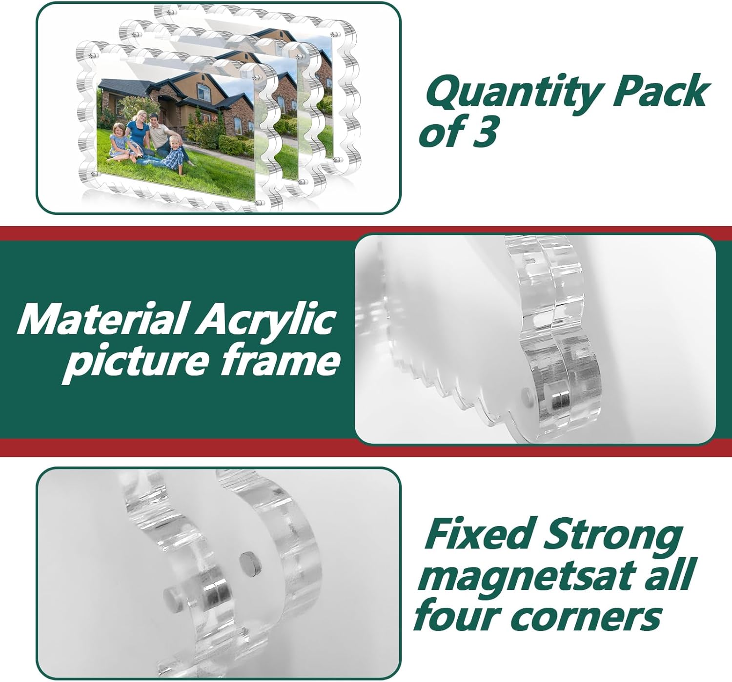 • 5x7 Acrylic Picture Frame - Showcase your favorite memories with ease using our premium 5x7 inch acrylic picture frame. Its frameless design with scalloped edges and clear plexiglass material make it the perfect choice for displaying your cherished photos. The magnetic picture frame ensures easy updates and a secure display